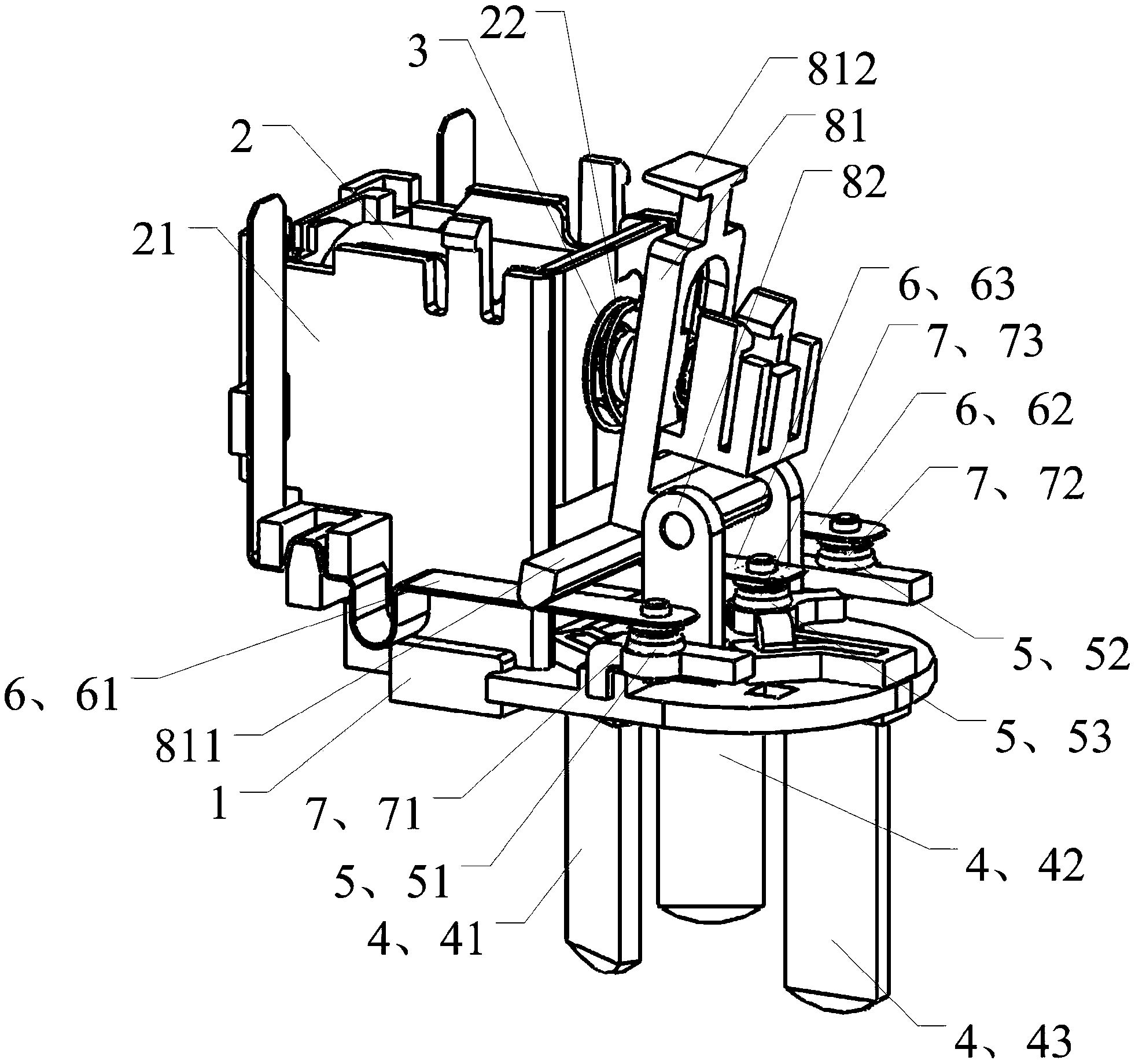 本实用新型涉及漏电保护技术领域,特别是涉及一种上电自动复位、断电自动脱扣的漏电保护装置,本方案中的脱扣线圈从电源接头取电,因此电源是否发生电源故障,将直接影响脱扣线圈是否通电产生磁场;衔铁与电源弹片连接,若电源没有发生故障,脱扣线圈通电产生磁场,吸合衔铁,衔铁锁定电源弹片使得动触点与静触点贴合,此时负载能够从电源接头得电;若电源发生故障,则脱扣线圈无法从电源接头取电,释放衔铁,解除对电源弹片的锁定,电源弹片在自身弹力作用下使得动触点与静触点分离,负载与电源之间线路断开;通过此设计,本漏电保护装置在电源正常工作时能够自动复位,电源发生故障断电时能够自动脱扣,保证了负载端的安全。