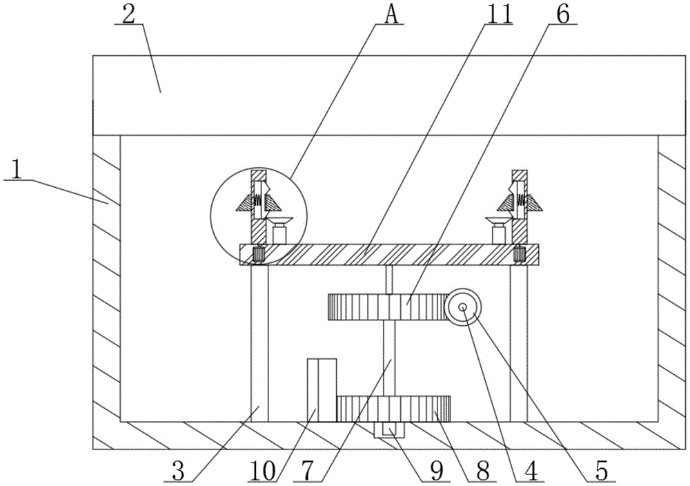 本实用新型涉及喷丸机技术领域,尤其为一种数控喷丸机用工件固定装置,包括装置外壳,所述装置外壳前端面滑动连接有装置移门,装置外壳顶端固定连接有底座,所述装置外壳后端面内侧固定连接有第一电机,所述第一电机主轴末端固定连接有蜗杆,所述蜗杆左侧啮合有蜗轮,所述蜗轮底端固定连接有连接杆,所述连接杆底端固定连接有齿轮,所述齿轮底端固定连接有滑块,所述齿轮左侧啮合有齿条,所述齿条底端与所述装置外壳底端内侧固定连接,所述蜗轮顶端通过转轴转动连接有放置板,本实用新型中,通过设置的套杆、弹簧、限位块和推板,使用十分方便快捷,这种固定方式操作十分简单,固定方便,便于取出,且固定稳定,打打提高装置上料的效率。