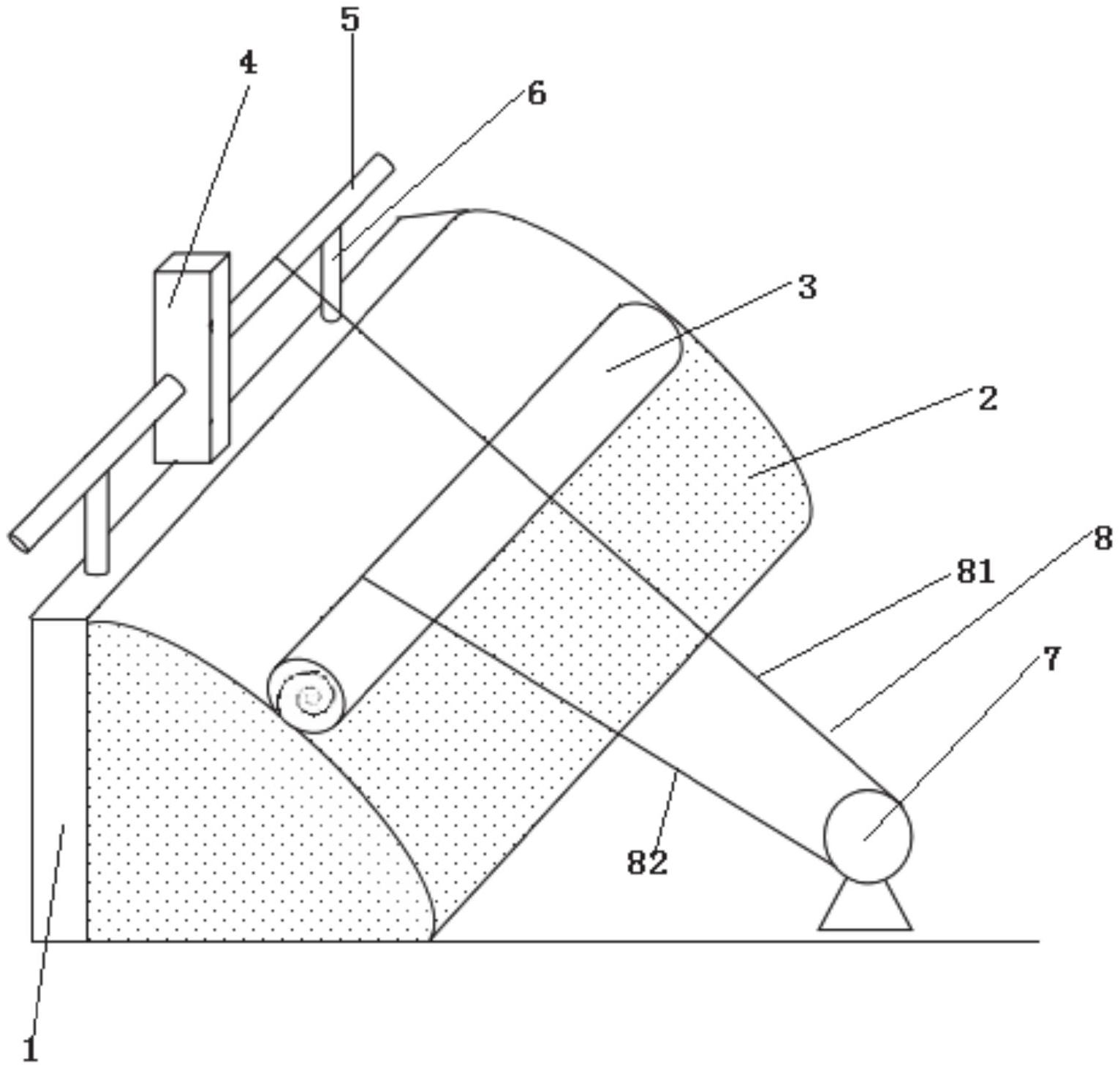 本实用新型涉及大棚领域,具体提供一种收落保温毡的后墙固定式卷毡机大棚,包括后墙,靠在后墙上的大棚主体,使用时覆盖在大棚主体上的保温毡,保温毡内卷有卷毡杆。后墙顶部通过立柱固定有拉绳卷杆,后墙顶部放置有电机,拉绳卷杆与电机相连。拉绳卷杆上缠绕有落毡拉绳,落毡拉绳与固定于地面的定滑轮相连,落毡拉绳在定滑轮处改变方向,另一端系在卷毡杆上,随卷毡杆一同卷于保温毡中。解决当大棚主体坡面过于平缓时,仅依靠保温毡自重不足以克服阻力下落的问题。