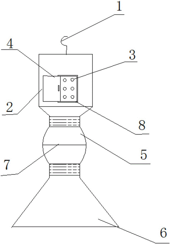 本实用新型公开了一种捕捉活体果蝇的装置,包括捕捉瓶、诱剂瓶和连接体,所述捕捉瓶体与诱剂瓶体为的瓶口为内螺纹,连接体两头为外螺纹,所述诱剂瓶和捕捉瓶通过连接体螺纹连接,所述捕捉瓶体包括捕捉瓶体侧面设置的收集孔、收集孔上下两侧的滑道和与滑道配套使用的可拉伸的遮挡板,所述连接体中间设置防虫网,所述捕捉瓶顶部有挂钩,本装置能保证捕捉到的果蝇的活力,便于活体果蝇的诱集,有利于后续研究的展开,解决了捕捉活体果蝇的效率低、捕捉到的果蝇活力降低的问题。