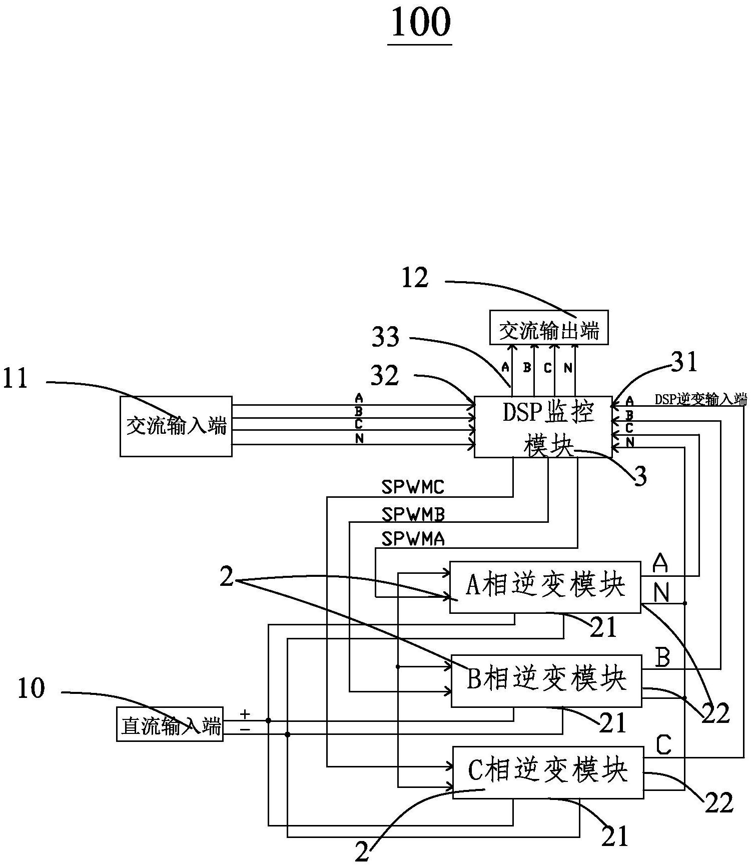 本实用新型涉及一种模块化组合式三相逆变电源,包括直流输入端及与DSP监控模块电连接的交流输入端、三组所述单相逆变模块和交流输出端,所述直流输入端与三组所述单相逆变模块分别电连接,以给三组所述单相逆变模块分别输入直流电,所述DSP监控模块产生三组相位互差120度的SPWM逆变信号分别输出至三组所述单相逆变模块以进行逆变控制并分别接收单相逆变模块输出的逆变电压,所述交流输出端用于输出交流电以给负载供电,所述交流输入端用于输入交流电。该电源使用元器件较少,由DSP监控模块集中控制协调,实现控制全数字化,工作可靠、稳定。