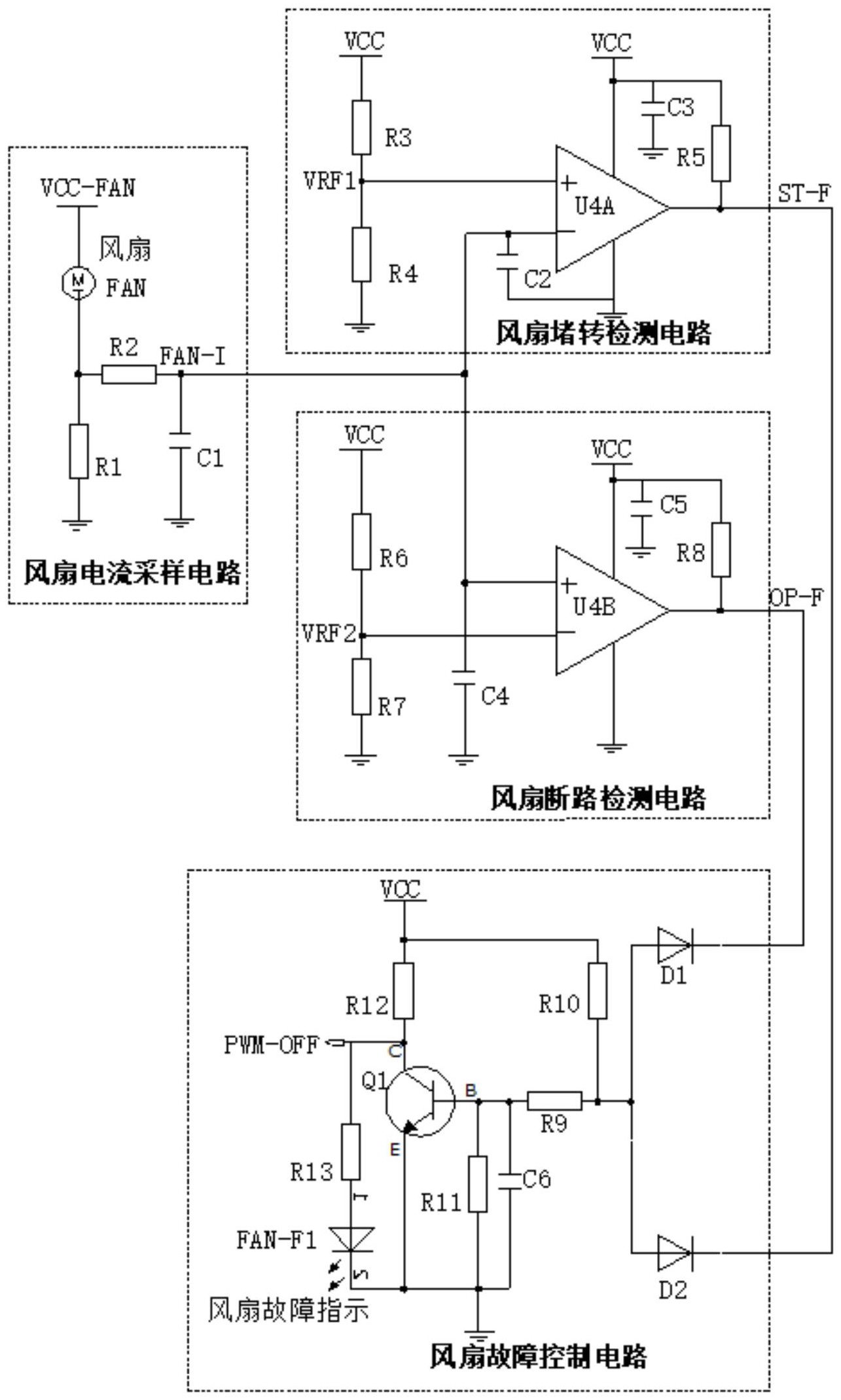 本实用新型涉及一种地铁直转交设备的风扇检测电路,包括电流采样电路、风扇堵转检测电路、风扇断路检测电路、风扇故障控制电路,所述电流采样电路的输出端连接所述风扇堵转检测电路的反相输入端和所述风扇断路检测电路的同相输入端,所述风扇堵转检测电路的同相输入端连接基准电压VREF1,所述风扇堵转检测电路的输出端连接所述风扇故障控制电路的输入端,所述风扇断路检测电路的反相输入端连接基准电压VREF2,所述风扇断路检测电路的输出端连接风扇故障控制电路的输入端,所述风扇故障控制电路的输出端分别控制风扇故障告警指示和直转交设备的PWM控制电路,结够简单,大大提高了地铁直转交设备的可靠运行。