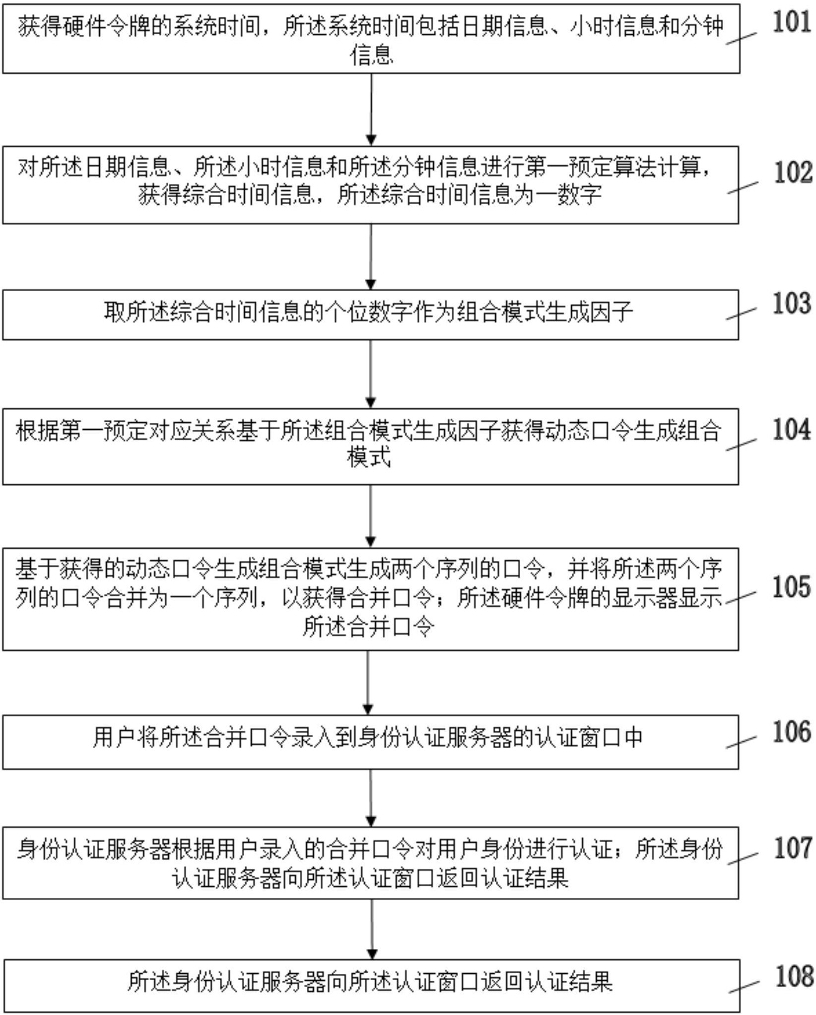 本发明涉及一种基于组合模式的动态口令生成方法,包括,获得硬件令牌的系统时间,基于所述系统时间获得所述硬件令牌当前系统时间的动态口令生成组合模式,所述动态口令生成组合模式包括静态加时间同步模式、静态加事件同步模式、静态加挑战应答模式、时间同步加事件同步模式、时间同步加挑战应答模式、事件同步加挑战应答模式,基于获得的动态口令生成组合模式生成两个序列的口令,并将所述两个序列的口令合并为一个序列,以获得合并口令,身份认证服务器对所述合并口令进行验证。通过本发明,能够提高动态口令的安全性能,避免动态口令被轻易破解,从而有效地保障了消费者和商家的经济利益。