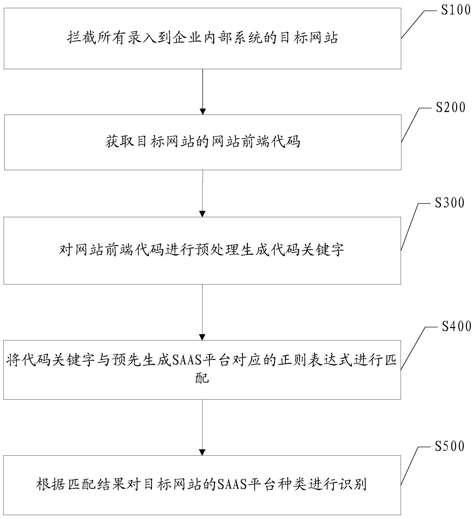 本发明公开了一种识别SAAS平台种类的方法、装置及设备,该方法包括:拦截所有录入到企业内部系统的目标网站;获取目标网站的网站前端代码;对网站前端代码进行预处理生成代码关键字;将代码关键字与预先生成SAAS平台对应的正则表达式进行匹配;根据匹配结果对目标网站的SAAS平台种类进行识别。本发明实施例通过网站代码、SAAS规则及关键字的方式实现自动SAAS平台的判断,自动识别方式可在短时间内实现大量的网站分析识别,减少了识别时间,提高了识别效率。