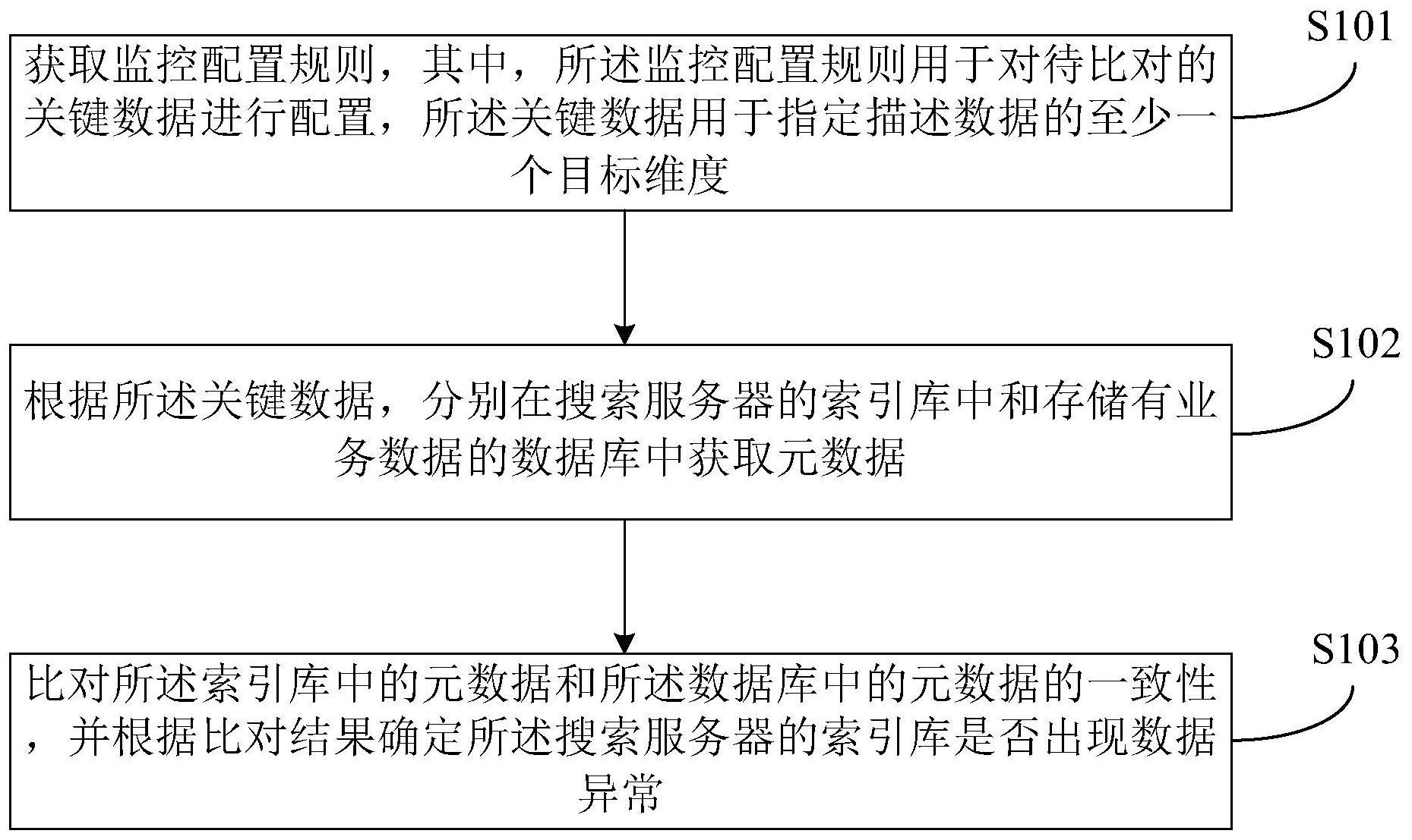 本发明实施例公开了一种数据监控方法、装置、设备和存储介质,该方法包括:获取监控配置规则,其中,所述监控配置规则用于对待比对的关键数据进行配置,所述关键数据用于指定描述数据的至少一个目标维度;根据所述关键数据,分别在搜索服务器的索引库中和存储有业务数据的数据库中获取元数据;比对所述索引库中的元数据和所述数据库中的元数据的一致性,并根据比对结果确定所述搜索服务器的索引库是否出现数据异常。本发明实施例解决现有技术中在面对搜索服务器数据不一致问题时,采用将所有数据重新灌入索引库的方法而带来的大量资源浪费的问题,实现对搜索服务器数据一致性的高效监控,并且通过关键数据的灵活配置,提高方法的灵活性和适用性。