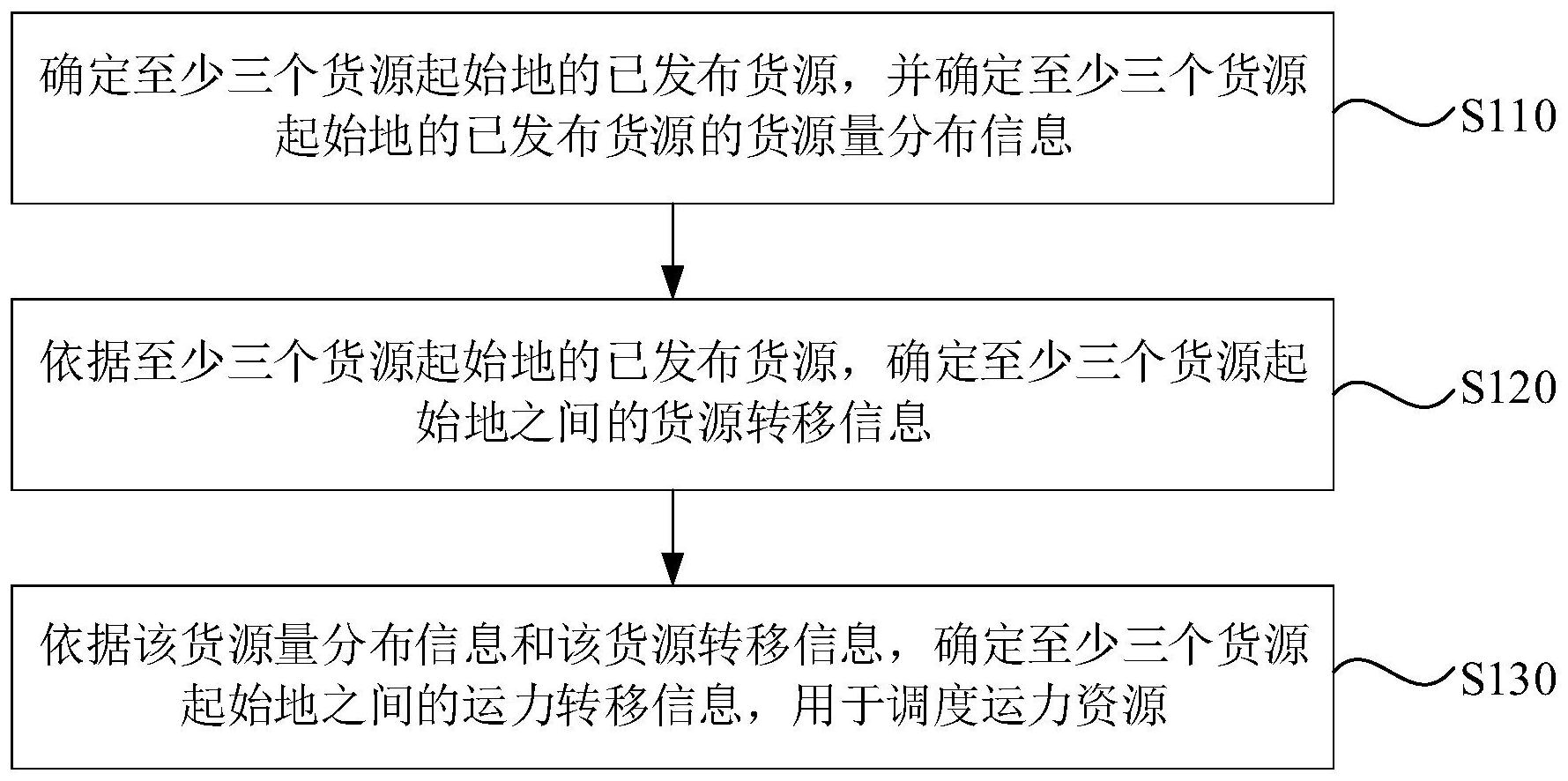 本发明实施例公开了一种运力资源的调度方法、装置、设备及存储介质。所述方法包括:确定至少三个货源起始地的已发布货源,并确定所述已发布货源的货源量分布信息;依据所述已发布货源,确定所述至少三个货源起始地之间的货源转移信息;依据所述货源量分布信息和所述货源转移信息,确定所述至少三个货源起始地之间的运力转移信息,用于调度运力资源。利用上述技术方案,能够根据货源量的分布情况以及货源的转移情况,从全局角度为各个货源需要的运力转移情况,进而根据运力转移情况为各个货源起始地进行运力资源的合理分配和调度。