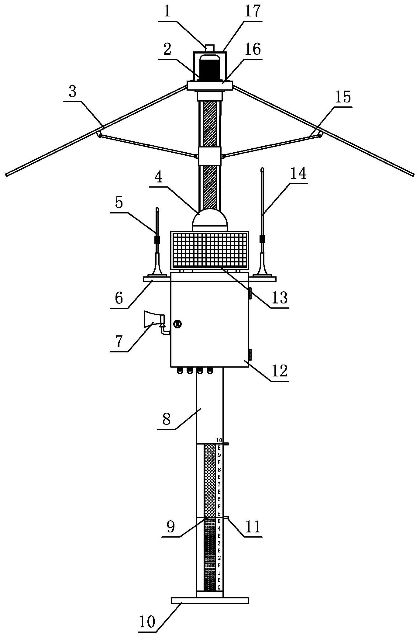 本实用新型属于水利水电工程领域,尤其是一种基于物联网的河道整治监测系统,针对现有的水位监测系统在使用的时候,设备容易被淋坏,提高了设备损坏率的问题,现提出如下方案,将天气监测传感器、旋转电机、旋转防雨板、支撑圆杆、旋转防护座、防护罩、旋转轴承座、内螺纹套柱、固定套柱、电动液压缸、外螺纹杆、旋转座和固定连接圆杆组成伸缩遮雨装置,通过天气监测传感器的检测,以及控制箱对电动液压缸、旋转电机、内螺纹套柱和外螺纹杆的控制,就可以更好地带动支撑圆杆和旋转防雨板进行旋转展开工作,从而就可以更好地进行防雨水工作,避免电气设备的损坏,这样就降低了设备的损坏率。