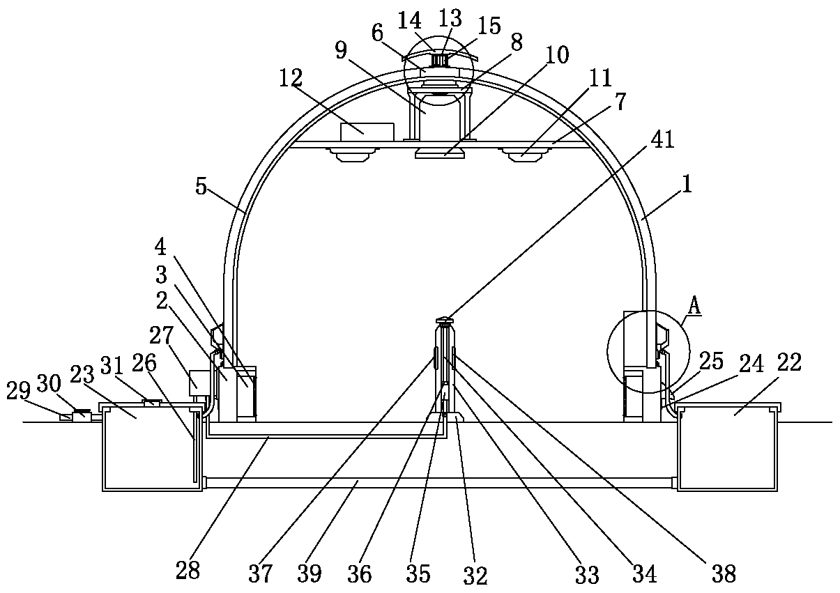 本实用新型公开了一种用于温棚智能控温控湿装置,包括主控制器,所述主控制器的输入端分别与流量监测传感器的输出端、温度传感器的输出端和空气湿度传感器的输出端相电性连接,所述流量监测传感器的输出端还与电磁阀的输入端相电性连接,所述电磁阀的输出输入端还与主控制器的输出输入端相电性连接,所述主控制器的输出端还分别与鼓风机、抽风机和水泵之间相电性连接,其主控制器的输出端还与温控仪的输入端相电性连接,温控仪的输出端与取暖灯相电连接。本实用新型通过设置的温度传感器、空气湿度传感器,流量监测传感器、电磁阀,再配合设置的主控制器,使得该用于温棚智能控温控湿装置能够对温棚内的温度和湿度进行自动监控并同时起到自动调节的作用。