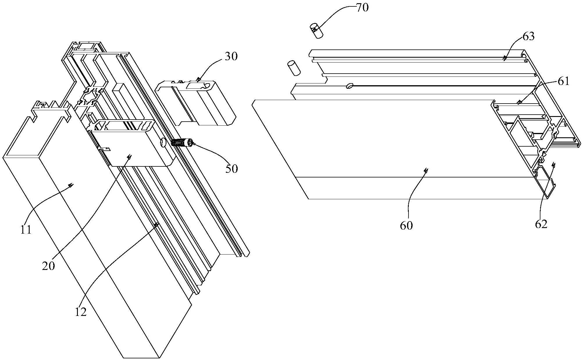 本实用新型公开了一种门窗装配系统,包括玻璃板、第一框体、第二框体、第一连接件以及第二连接件,第一框体的前端形成为加强部,第一框体的后端设有第一连接槽,第一连接槽的靠近加强部的侧壁端面设有第一安装槽,第一连接槽的远离加强部的侧壁端面设有胶液层;第二框体的顶端设有第二安装槽,第二框体的底端设有第二连接槽;第二安装槽的两个侧壁上均设有滑槽,第一安装端以及第二安装端分别安装在两个滑槽内;玻璃板的竖直边沿安装于第一连接槽内;玻璃板的水平边沿安装于第二连接槽内。本实用新型的门窗装配系统,其可相对收窄装配于玻璃板竖直边沿的第一框体的宽度,增加玻璃门窗的可视面积。