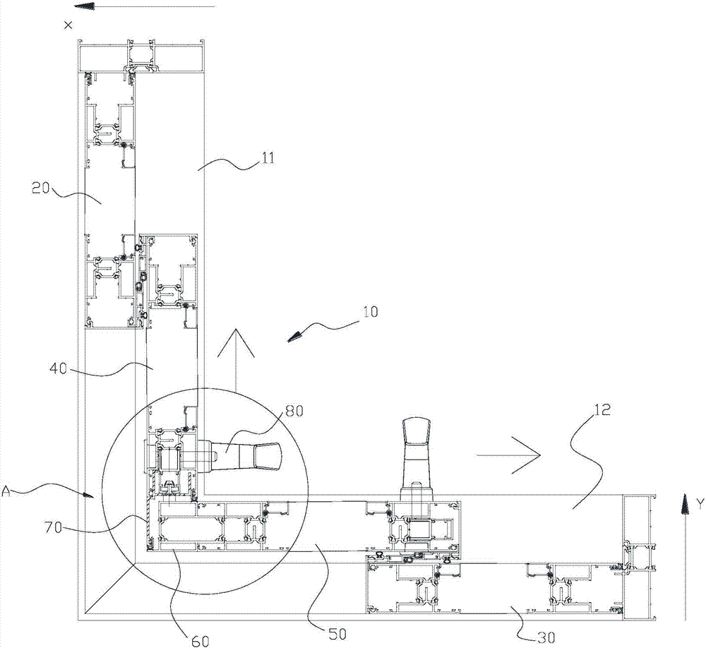 本实用新型公开了一种90度转角无立柱推拉门,包括锁紧组件,包括连通的第一框体和第二框体的L型框架;还包括固定在第一框体内的第一固定扇、固定在第二框体内的第二固定扇、活动安装在第一框体内并与第一固定扇错开设置的第一活动扇、活动安装在第二框体内并与第二固定扇错开设置的第二活动扇、活动安装在第二框体内并固定在第二活动扇的转角铝型材;第一活动扇固定有与其挡板配合形成用于容纳转角铝型材的L型容纳槽;L型容纳槽设有第一密封胶条和第二密封胶条;转角铝型材设有第一贴合面和第二贴合面;锁紧组件用于选择性地锁紧或松开第一活动扇和转角铝型材。本实用新型能实现推拉门开启空间最大化,以利于大件物品的搬运和避免碰撞。