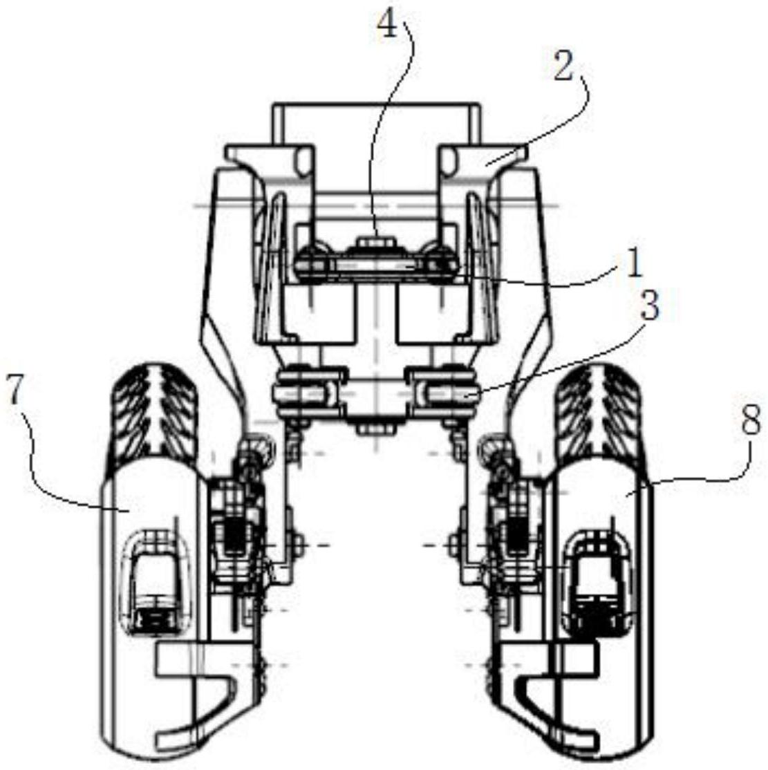 本实用新型提供一种转向复位结构及车辆,包括复位块、旋转块和用以同轴连接所述复位块与所述旋转块的转向连接组件;还包括两个气弹簧,两个所述气弹簧竖直安装于车架且分别设于所述复位块的左右两个轴承的正下方;所述旋转块通过两个关节轴承分别连接后轮左摆臂和后轮右摆臂。本申请可以实现转向及复位时的后轮组件小幅度顺滑摆动以及快速精准复位。
