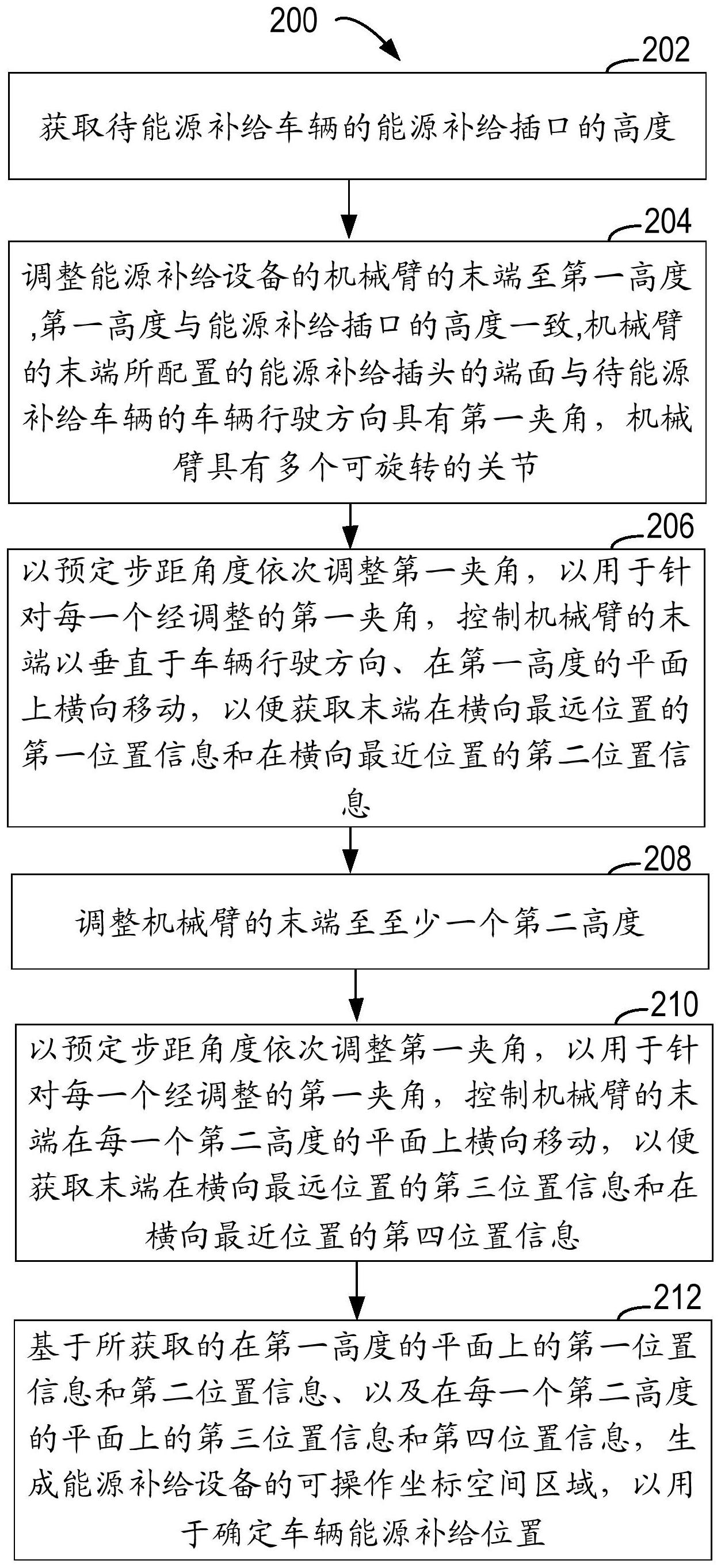 本公开涉及一种用于确定车辆能源补给位置的方法、计算设备和计算机可读存储介质。该方法包括:获取待能源补给车辆的能源补给插口的高度;调整能源补给设备的机械臂的末端至第一高度;以预定步距角度依次调整第一夹角,获取末端在横向最远位置的第一位置信息和在横向最近位置的第二位置信息;调整机械臂的末端至至少一个第二高度;针对每一个经调整的第一夹角,获取末端在横向最远位置的第三位置信息和在横向最近位置的第四位置信息;基于第一位置信息和第二位置信息、第三位置信息和第四位置信息,生成能源补给设备的可操作坐标空间区域,以用于确定车辆能源补给位置。本公开能够无需人工辅助,精准并及时地指示合适的车辆能源补给位置。