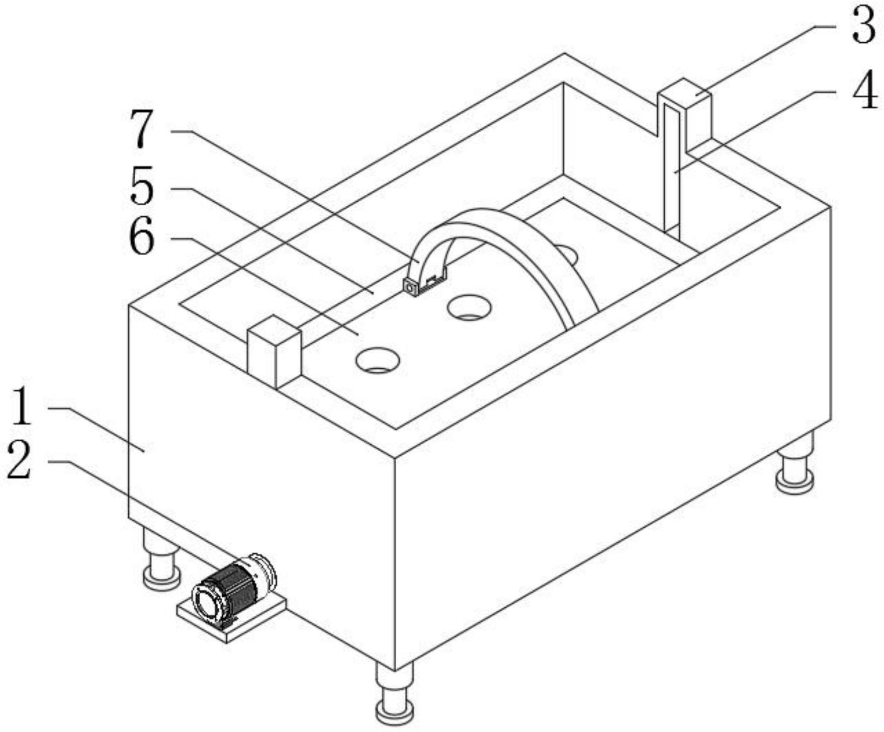 本实用新型公开了一种生猪屠宰用浸烫装置,包括水槽箱,水槽箱顶部的中心两端均固定设有支撑柱,水槽箱的内部穿插设有支撑框,支撑框的内壁设有抽拉板,其中一个支撑柱的内部转动设有丝杆,其中另一个支撑柱的内壁固定设有滑杆,丝杆的外壁与滑杆的外壁均套设有连接环,两个连接环的外壁均固定设有连接块,支撑框的两侧均与其位置相对应的连接块的一端固定连接。本实用新型一种生猪屠宰用浸烫装置,通过在水槽箱的内部设置有支撑框,支撑框在水槽箱内升降,从而则带动抽拉板可进行升降稳固调节,下降净烫加工,上升沥水,无需用户直接的拿取和放置,避免了用户接触水槽内的热水,提高了用户的使用安全性。