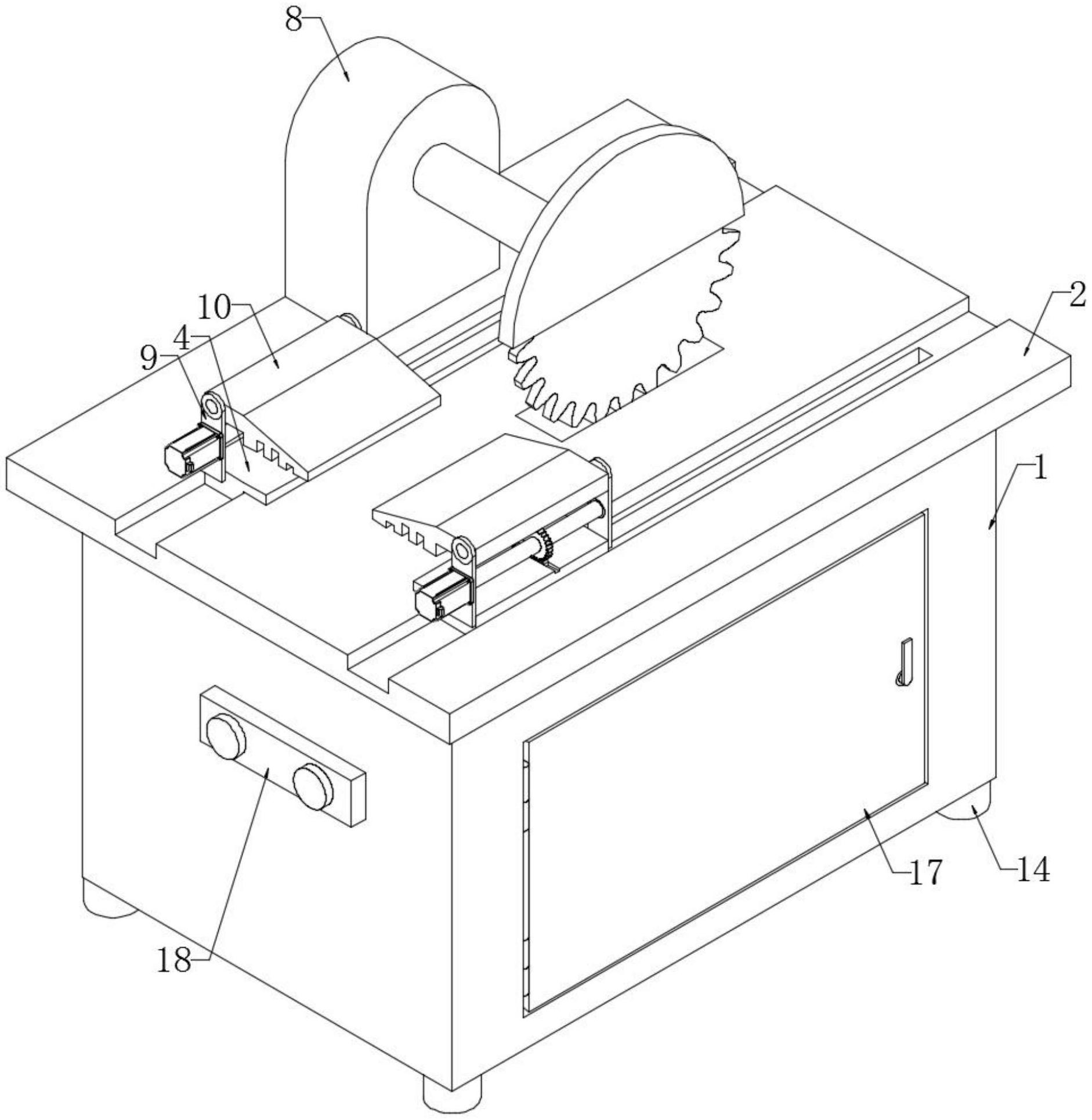 本实用新型公开了一种用于生猪屠宰的切割锯,包括支撑箱,支撑箱顶端与支撑板底端固定,支撑板顶端两侧均开设有滑槽,滑槽内壁底部均开设有活动口,滑槽内壁均滑动有放置块,本实用新型通过启动电机驱动曲柄,曲柄进行圆周运动,曲柄与连接条的连接处在连接条内移动,推动连接条往复移动,带动放置块往复移动,使猪肉与切割锯主体接触切割,减少了人力成本的消耗,省时省力,提高切割效率,将猪肉放置在两个放置块上,启动马达驱动连接轴,齿轮转动,使齿条移动,通过连杆的传递,拉动压紧块在连接耳之间偏转,对放置的猪肉进行压紧固定,避免油脂使猪肉在切割的过程中发生偏移现象,保证切割锯主体的切割效果。