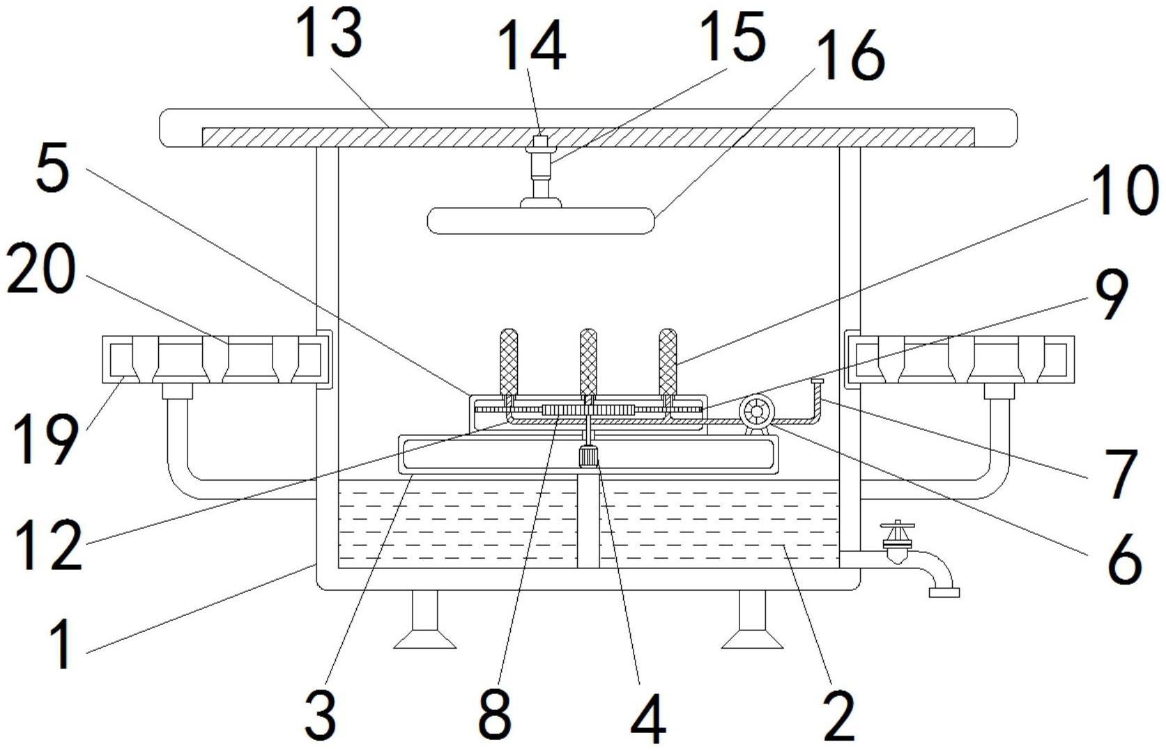 本实用新型涉及酱油瓶清洗技术领域,且公开了一种新型酱油瓶清洗设备,包括设备本体,所述设备本体的内腔底部固定安装有水箱,所述设备本体的内腔固定安装有位于水箱上方的平板,所述平板的内腔固定安装有电机,所述平板的顶部安装有清洗台,所述平板的顶部安装有位于清洗台右侧的高压水泵。该新型酱油瓶清洗设备,通过将进水口接上水源,清洗台的内腔安装有与电机输出轴处连接的第一齿轮,第一齿轮外部啮合有第二齿轮,第二齿轮的安装有清洗刷,故电机转动时,可以带动清洗刷对酱油瓶内腔进行清洗,清洗完成后,电动升降杆上升,使清洗刷从酱油瓶内脱离,并电动滑块滑至最右侧,将清洗完成的酱油瓶放入右侧置物板的置物孔内。