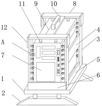本实用新型公开了一种基于云计算的大数据信息分析系统,包括底座,所述底座底部的前后两端对称设置有锥形支座,所述底座顶部的前后两端对称设置有槽型架,两个所述槽型架相对一侧下端的左右两侧对称设置有第一下挡板,两个所述槽型架相对一侧中部的左右两侧对称固定连接有侧挡板,两个所述槽型架的相背一侧下端对称固定连接有第二下挡板,两个所述槽型架内腔的底部不同分别设置有橡胶层。该基于云计算的大数据信息分析系统,通过设置的槽型架、侧挡板、第一下挡板、第二下挡板、维护板的相互配合可以方便对大数据信息分析装置进行固定,同时可对大数据信息分析装置的棱角进行防护,避免了磕碰对大数据信息分析装置造成损坏。
