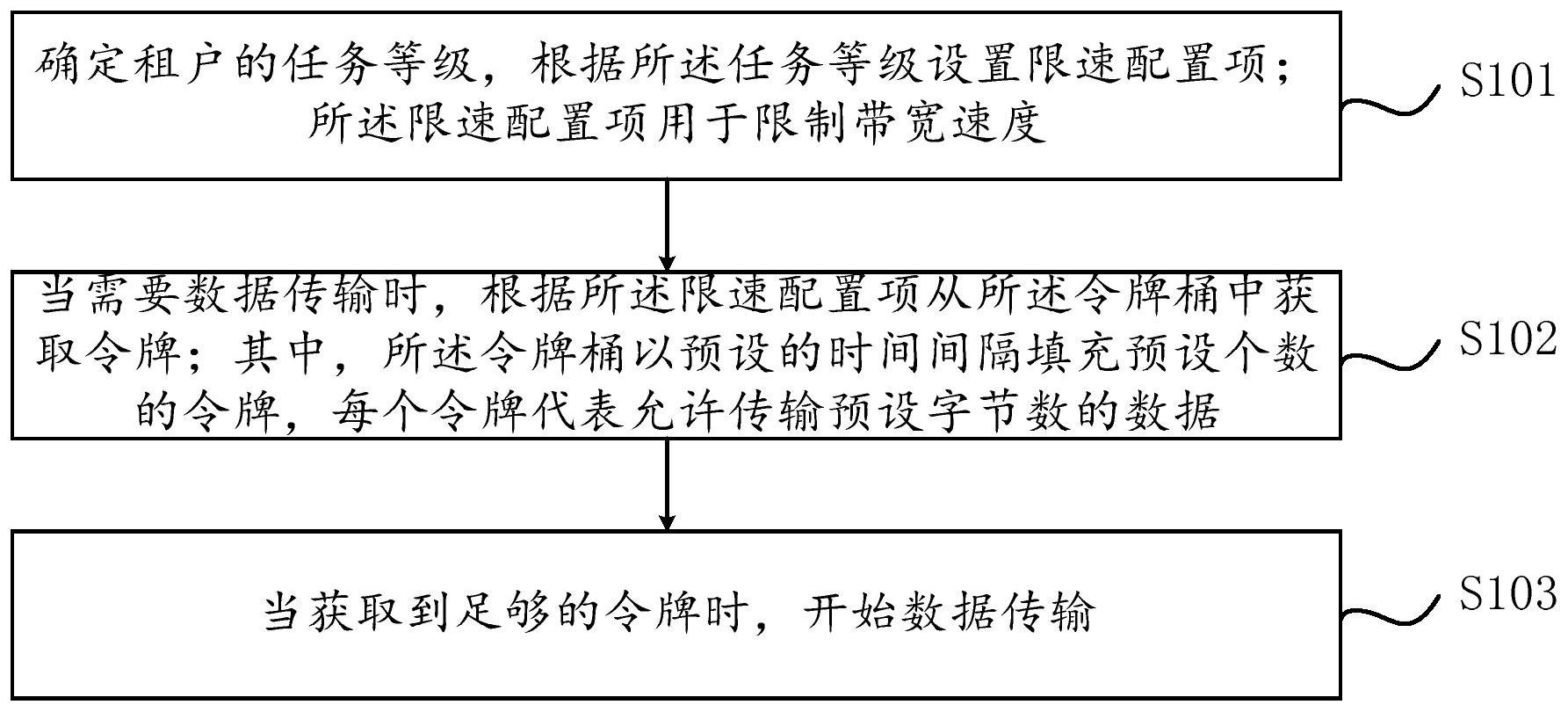 本发明涉及一种热磁存储和蓝光存储之间的数据传输限速方法及装置,所述方法包括确定租户的任务等级,根据任务等级设置限速配置项;限速配置项用于限制带宽速度;当需要数据传输时,根据限速配置项从令牌桶中获取令牌;其中,令牌桶以预设的时间间隔填充预设个数的令牌,每个令牌代表允许传输预设字节数的数据;当获取到足够的令牌时,开始数据传输。本发明的目的在于解决对租户级别和任务等级的限速,当用户传输对象时,会根据租户获取到的限速速值进行传输,传输速度不会超过这个限速速值,租户在创建归档任时,可以配置归档任务的权重,目前为用户提供了高中低三个权重选项,权重高的任务,传输速度就快一些。