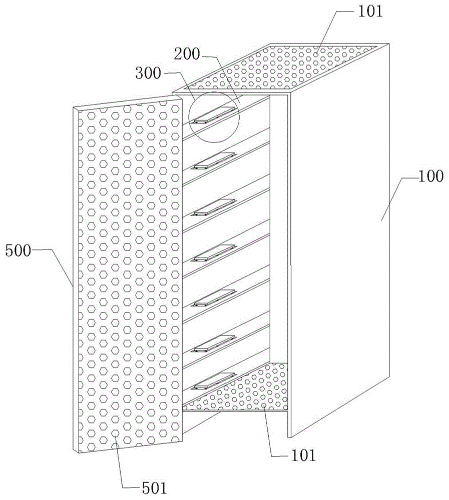 本实用新型涉及服务器的辅助放置装置技术领域,具体涉及一种服务器放置装置。该放置装置包括:壳体,在所述壳体内壁两端至少设置一对用于支撑服务器的支撑架,在所述支撑架上靠近所述服务器的一侧设有减振结构,所述减振结构包括设置于所述支撑架上的凹槽、设置于所述凹槽中的弹性件和设置于所述弹性件远离所述凹槽的一端的支撑板;在所述弹性件由于所述服务器的重力作用处于压缩状态下,所述支撑板远离所述弹性件的一侧高于所述支撑架靠近所述支撑板的一侧。在服务器的重力作用下,支撑板压缩弹性件,支撑板的表面高于支撑架的表面,以使服务器与支撑架不直接接触,通过弹性件衰减外界输入的能量,减轻支撑架或者防止支撑架的共振。