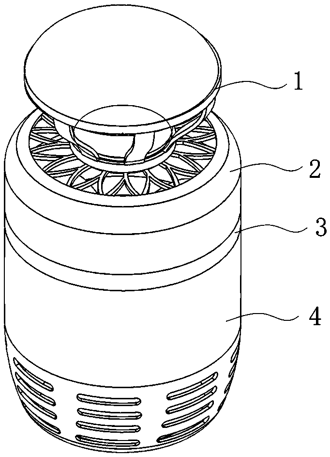 本实用新型公开了一种引诱型灭蚊器,其包括:滤蚊桶,滤蚊桶的桶壁上设有滤蚊孔;吸气装置,吸气装置包括风扇以及由上至下依次连接的上部连接圈、中部衔接段和下部连接圈;吸气装置设置在滤蚊桶的上方,吸气装置的下部连接圈插入滤蚊桶并卡在中部衔接段的位置;进气罩,进气罩安装在吸气装置的上方,吸气装置的上部连接圈插入进气罩并卡在中部衔接段的位置;顶盖,顶盖安装在进气罩的上部,顶盖上安装诱蚊装置。在本实用新型的引诱型灭蚊器中,吸气装置的第一个功能是利用风扇进行抽气,另一个功能是连接滤蚊桶和进气罩。所形成的新结构在满足滤蚊桶便于拆解清理的前提下,更加美观。