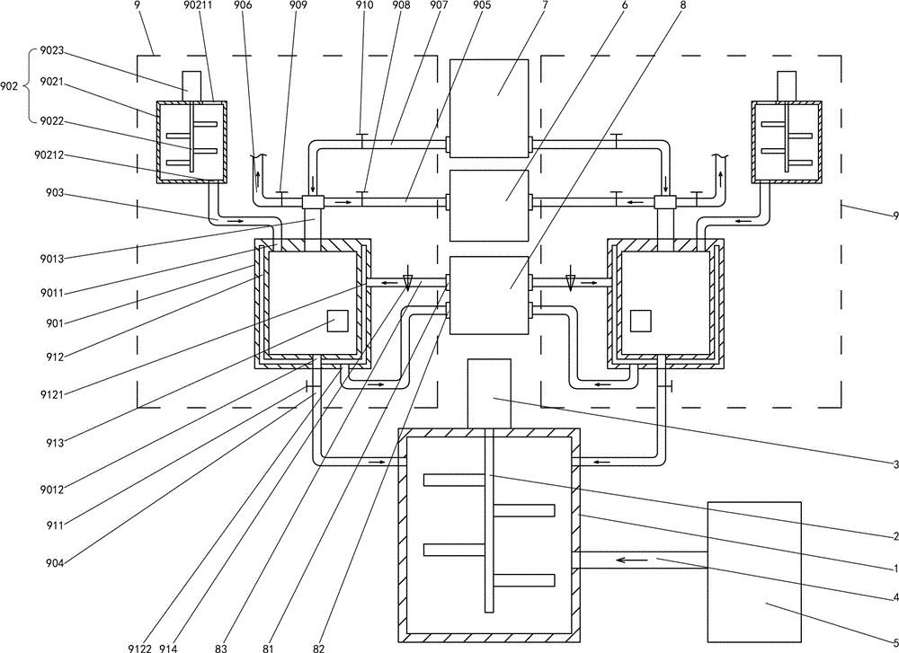 一种充气熬糖设备,包括机架、搅拌罐、第一搅拌器、第一驱动电机、高压风机、抽真空装置、加压气筒、导热介质供给装置和至少一糖浆熬煮装置,搅拌罐与高压风机连通,糖浆熬煮装置包括熬煮罐、糖浆供给装置、抽气管、水汽排放管和加压管,熬煮罐进料口通过进料管与糖浆供给装置连通,熬煮罐出料口通过出料管与搅拌罐连通;抽气管、水汽排放管、加压管一端均与熬煮罐连通,抽气管另一端与抽真空装置连通,加压管另一端与加压气筒连通,抽气管安装有第一开关阀,水汽排放管安装有第二开关阀,加压管安装有第三开关阀,出料管安装有第四开关阀;熬煮罐侧壁设有加热夹层。本实用新型能够有效提高糖果的品质和口感,而且可避免糖浆水蒸汽造成空气污染。