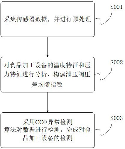 本发明涉及数据处理技术领域,具体涉及一种食品加工设备智能监测管理方法及系统,该方法获取温度时序数据、压力时序数据以及流量时序数据;根据各时间窗口内的温度特征获取各时间窗口的食材释放气体影响因子;结合压力时序数据获取各时间窗口的加热设备压力调节序列;进一步根据流量时序数据获取各时间窗口的泄压阀压差序列;获取基于时间窗口的泄压阀压差均衡指数;获取基于时间窗口的异常因子;从而完成食材加工设备的异常检测,提高异常检测结果的精准度,保证了食材加工设备的监测效果。
