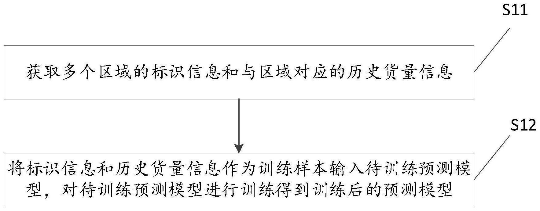 本发明提供一种货量预测模型构建方法、货量测量方法、装置及电子设备,其中,方法包括:获取多个区域的标识信息和与所述区域对应的历史货量信息;将所述标识信息和所述历史货量信息作为训练样本输入待训练预测模型,对所述待训练预测模型进行训练得到训练后的预测模型。在模型训练时,采用的训练样本为多个区域的标识信息和区域对应的历史货量信息,训练出的预测模型可以预测多个地点的货量信息,可以有效降低构建预测模型的复杂度,并且可以有效增加样本数量,提高预测模型的识别精度,可以有效解决现有技术单独针对一个地点或区域建立独立的预测模型,在历史货量数据有限的情况下,无法提高模型预测精度的问题。
