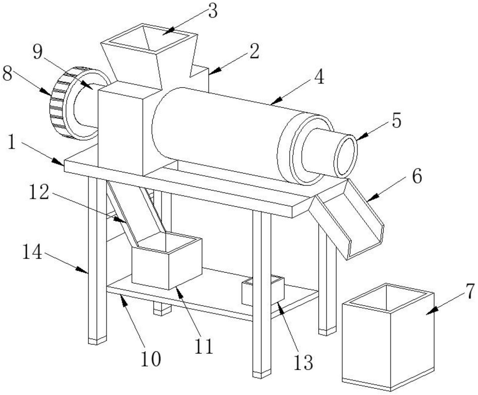 本实用新型公开了一种果汁饮料生产用榨汁装置,包括操作台,所述操作台的顶部左侧固定安装有进料箱,所述进料箱的顶部开设有进料斗,所述进料箱的右侧壁螺接装配有榨汁筒,所述榨汁筒的一端插接装配有出料筒,所述出料筒的下方设置有出料口,所述出料口的下方设有低浓度果汁收集箱,本实用新型结构紧凑合理,使用操作简单,能有效提高果汁饮料自动化生产效率,且便于对果肉残渣进行有效收集并处理,同时可以获得不同浓度的果汁饮料,可以根据饮料生产商要求,制造指定产品,其整体实用性强,适用范围广,利于推广使用。