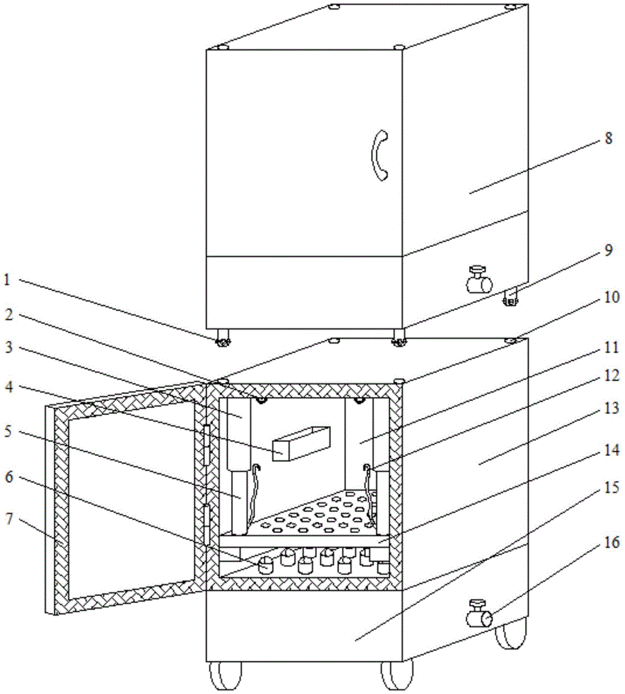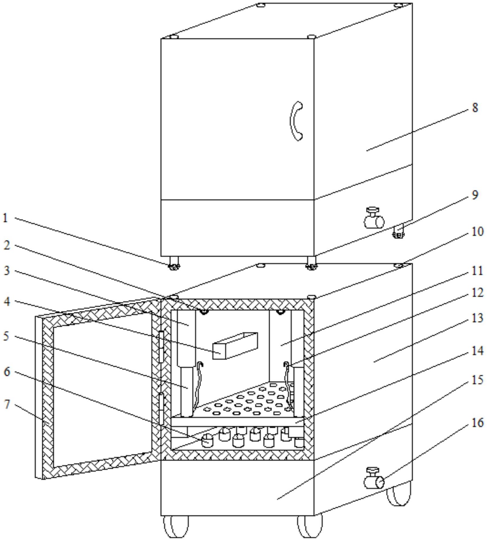 本实用新型公开了一种肉食品运输装置,包括第一箱体和第二箱体,所述第一箱体位于第二箱体的上方,所述第一箱体的底部四角设有用于连接第一箱体和第二箱体的连接机构,所述第二箱体包括储藏室和制冷室,所述储藏室位于制冷室的上方,所述储藏室和制冷室中部的隔板上贯穿有多个导热柱,所述储藏室内部滑动连接有放置板,所述放置板顶部一侧的两角均设有固定放置板位置的固定结构,所述储藏室内部两侧内壁均焊接有放置槽,所述放置槽顶部为敞口结构。本实用新型保存时间长且干冰或液氮不直接和肉食品接触,保证肉食品的肉质并保护工作人员的安全,可以改变储藏空间,且竖向设置节约占地空间、便于移动。