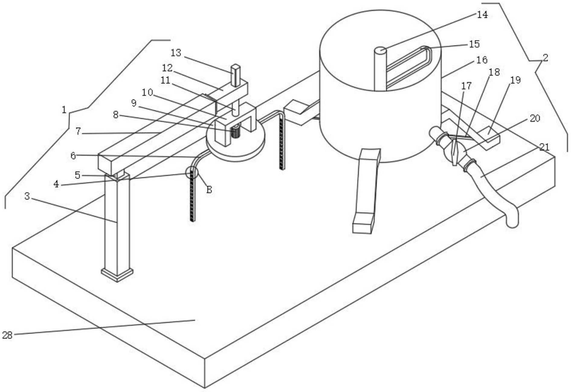 本实用新型公开了一种便于清洗的猪肉食品加工搅拌设备,涉及食品加工技术领域,包括清洗机构、加工搅拌系统与底座,底座上表面的左端固定连接有升降柱,升降柱的内部活动连接有升降杆,升降杆的上表面固定连接有连接块,连接块的上表面固定连接有伸缩臂,伸缩臂的内部活动连接有伸缩杆,伸缩杆的右侧固定连接有微调气缸,微调气缸贯穿伸缩杆,微调气缸的内部活动连接有微调伸缩杆。该便于清洗的猪肉食品加工搅拌设备,在搅拌时,通过搅拌电机带动旋转轴旋转,从而带动搅拌杆转动,通过三组搅拌杆上下与角度的错位能让搅拌杆转动时对食品进行充分的搅拌,在清洗时多个喷头喷水可以对搅拌杆与搅拌腔进行充分的清洗。