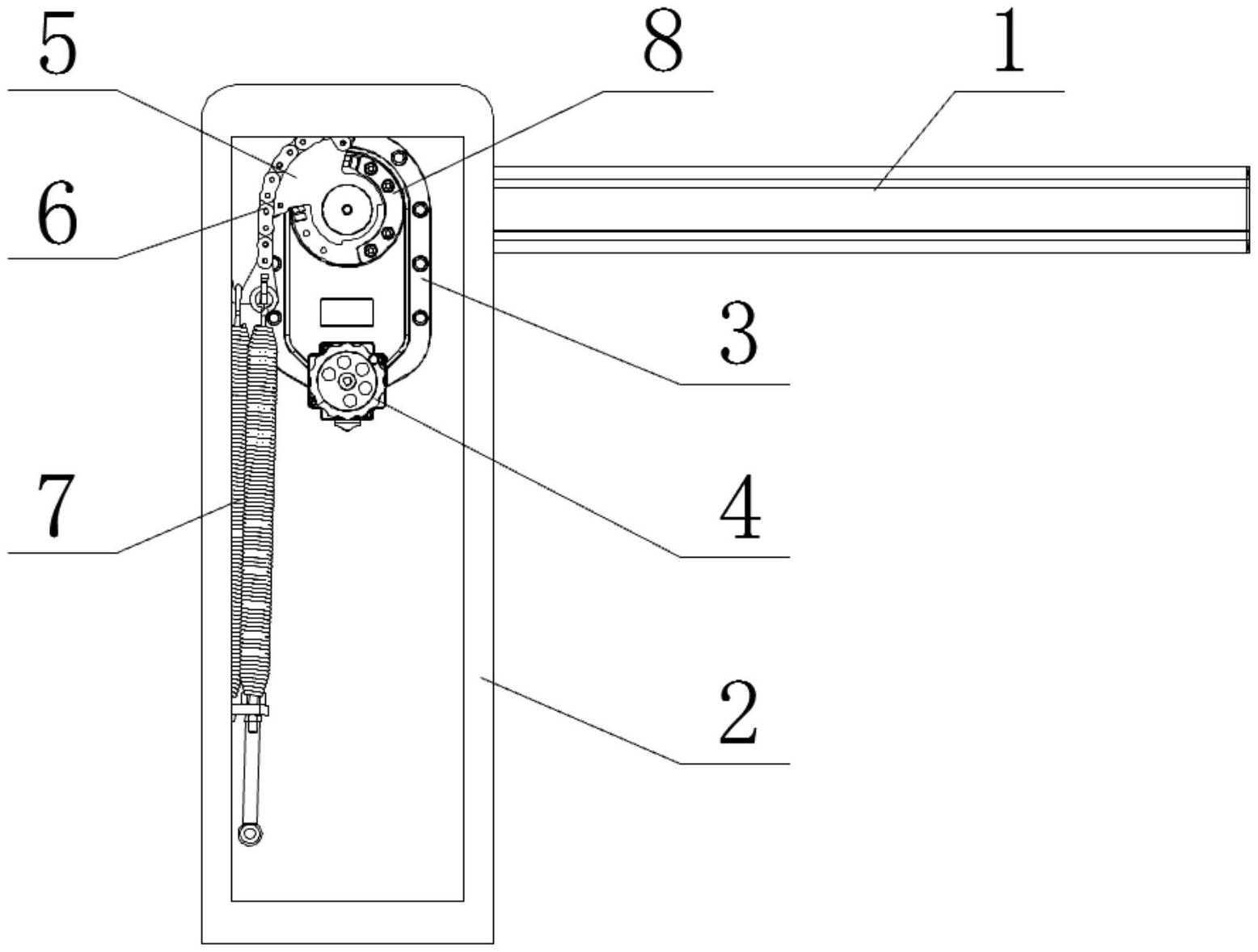 本实用新型公开了一种全齿轮传动的道闸机芯。现有道闸机芯有采用蜗轮蜗杆,虽可自锁,但传递效率低,且寿命短。本实用新型包括机箱,其上连接有减速传动机构,并由电机驱动;减速传动机构输出轴一端与闸杆连接,另一端与扇形链轮连接,扇形链轮上的链条一端与拉伸弹簧组件连接,拉伸弹簧组件与机箱连接;闸杆和拉伸弹簧组件对减速传动机构输出轴产生的扭矩方向相反;扇形链轮通过限位机构实现限位,保证闸杆在90°范围内转动。本实用新型采用全齿轮传动,传递效率高、功率损失小,产品使用寿命延长,在拉伸弹簧组件的作用下,闸杆位于不同的角度会锁死或缓慢降落。