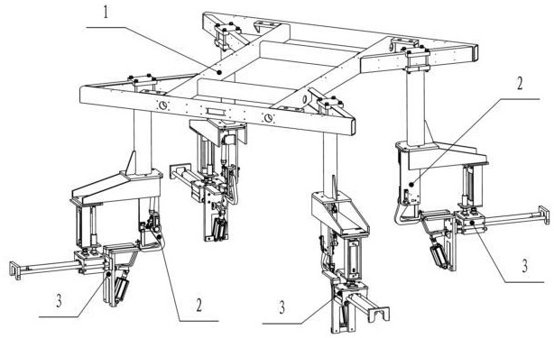 一种自动钩挂吨袋四角吊耳的装置,它包括吊袋框架,吊袋框架的四角下端沿对角线方向均设有吊钩机构和吊耳交接机构,吊钩机构包括立式底板,立式底板的侧面设有吊钩气缸,吊钩气缸的缸杆下端与摆动臂的上端铰接,摆动臂的下部与立式底板铰接,摆动臂与立式底板之间设有吊钩,吊钩与摆动臂可同轴转动,吊耳交接机构包括立式连接架,立式连接架上设有拉钩升降气缸,拉钩升降气缸的缸杆下端设有拉钩平移气缸,拉钩平移气缸的缸杆前端设有拉钩安装板,拉钩安装板的上端设有吊耳托板,拉钩安装板的中部与拉钩的后端铰接,拉钩的中部与拉钩摆动气缸的缸杆上端铰接,拉钩前端设有弯曲向上延伸的拉钩杆。本实用新型可以自动钩挂吨袋四角已撑开的吊耳。