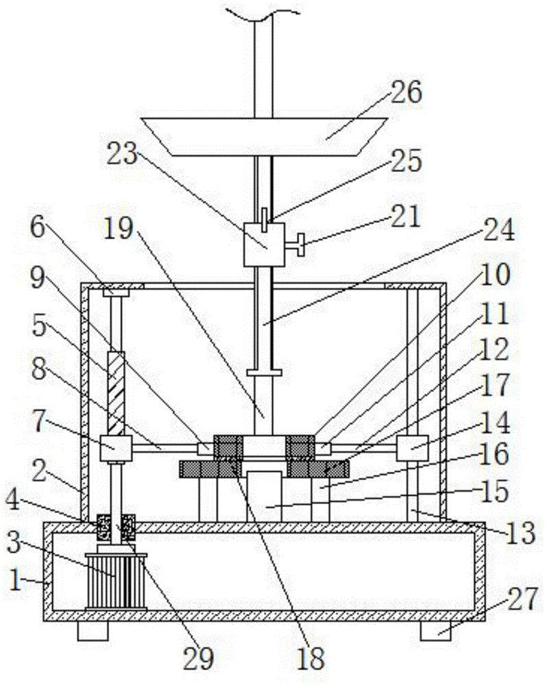 本实用新型属于口罩生产技术领域,尤其为一种用于生产防护口罩的呼气阀紧固测试装置,包括第一壳体,所述第一壳体的顶部固定连接有第二壳体、第一滑杆、放置块、支撑腿和支撑杆,所述第一壳体的顶部开设有通孔,且通孔内固定连接有第一轴承,所述第一壳体内固定连接有电动机,所述电动机的传动轴上固定连接有转轴,且转轴的另一端固定连接有螺纹柱;本实用新型,通过设置电动机,通过控制开关控制电动机转动带动转轴转动,使螺纹筒下降,螺纹筒带动第一连接杆下降,使第一环形压板和第二环形压板靠近,对需测试口罩进行固定,操作简单,通过设置螺栓,螺栓起到对第二滑筒进行定位,可以使第二滑筒的位置进行调节。