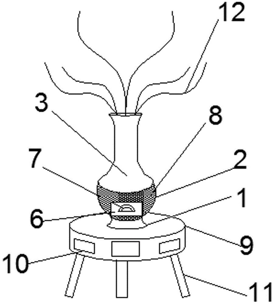 本实用新型公开了一种陶瓷花瓶熏香炉,包括陶瓷花瓶底座,所述陶瓷花瓶底座的一侧设有陶瓷瓶体,所述陶瓷瓶体远离瓶底的一侧设有陶瓷瓶颈,所述陶瓷瓶体与所述陶瓷瓶颈之间设有空腔,所述空腔的两端均设有陶瓷底板。有益效果:通过在花瓶上设有熏香炉,可以合理的应用空间,大大的提高了花瓶的实用性,陶瓷瓶体上设有若干透气小孔有利于熏香的气味的扩散,净化周围的环境,大大提高了人们在换取及清理时更加的方便快捷,在空腔内设有隔热板,应为熏香在燃烧的时候会产生大量的热量,可能会对陶瓷瓶颈中的花卉造成一定的伤害,通过设有隔热板极大的降低了对花卉的烫伤,更有有效的保护了花卉,这大大提高了周围环境的清新度同时也节省了空间。