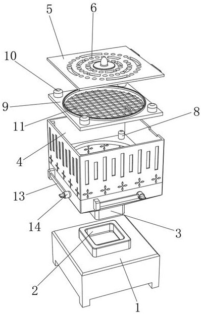 本实用新型公开了一种便于取灰的熏香盒,包括集灰盒,所述集灰盒的顶部固定连接有对接管,对接管的顶端密封插接有收集斗,收集斗的顶部固定连接有熏香盒本体,所述熏香盒本体的顶部卡接有盖板,盖板的顶部设有多个出烟孔,所述熏香盒本体内设有安装板,安装板的顶部卡接有钢丝网,所述熏香盒本体的两侧外壁均固定连接有固定块,固定块的一侧固定连接有弹力板,弹力板的另一端固定有敲击柱,敲击柱与熏香盒本体接触,所述盖板的顶部固定连接有拨动块。本实用新型通过对接管与收集斗密封插接的设置,从而保证熏香产生的香灰准确地落在集灰盒内,进而避免香灰下落的过程中掉落在桌面上,以便后续地清理。