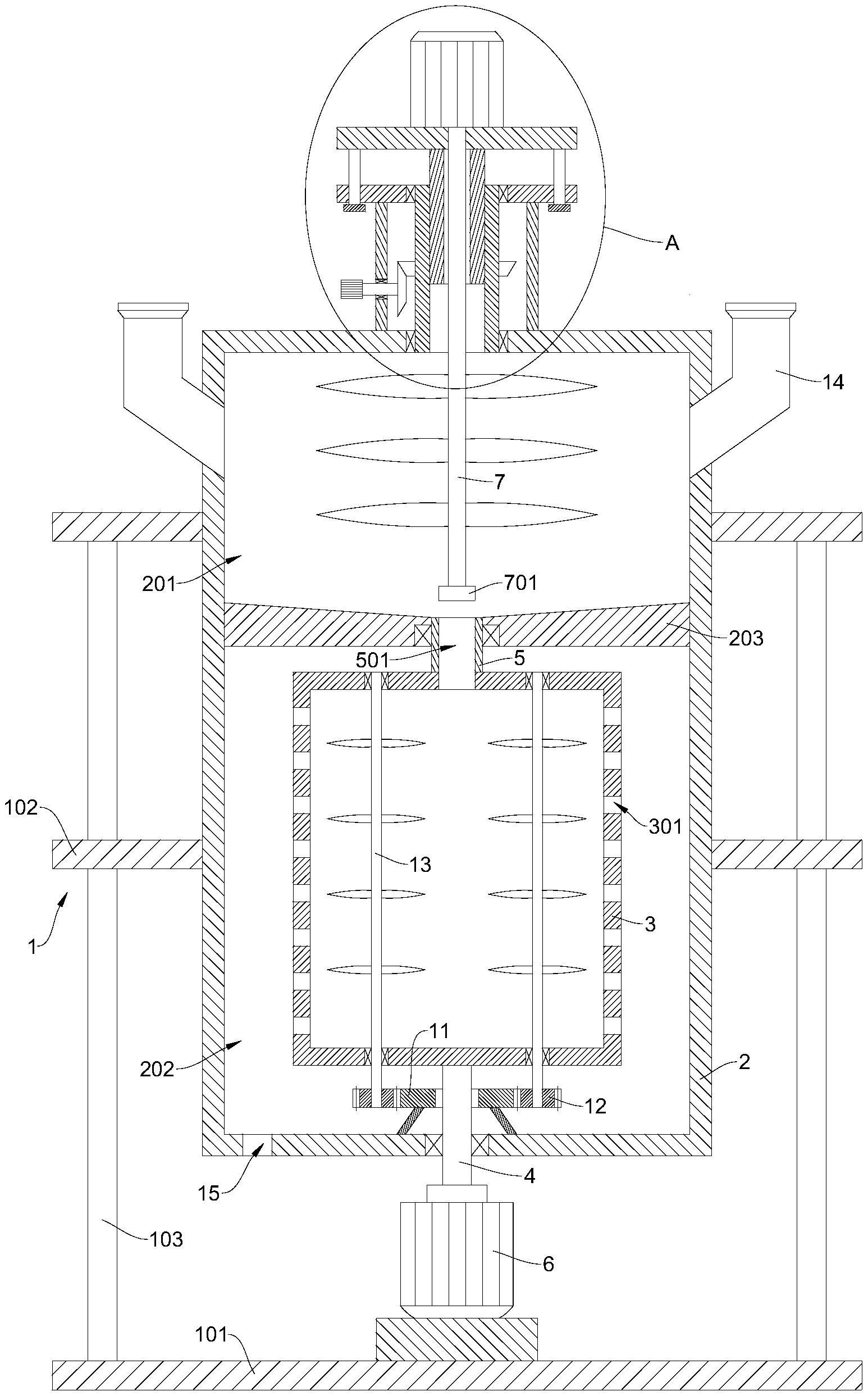 本实用新型提供了一种显影中合剂处理装置,包括支架,支架上固设有外筒,外筒的中部设有隔板,隔板将外筒分隔为上筒和下筒,下筒的内部设有可转动的内筒,内筒的侧壁设有若干过液孔,内筒的顶部与上筒连通,内筒的底部中心连接有第一电机,以驱动内筒转动,第一电机安装于支架上;上筒的内部设有第一搅拌轴,第一搅拌轴上沿轴向设有若干第一搅拌叶,外筒的顶部设有安装座,安装座上安装有第二电机,第二电机的输出轴与第一搅拌轴连接,第一搅拌轴的底端设有可与下液孔内壁配合的堵块,外筒的顶部设有用于驱动安装座升降的驱动机构。本实用新型能够提高中和剂各成分的混合效果,保证中和剂的质量。