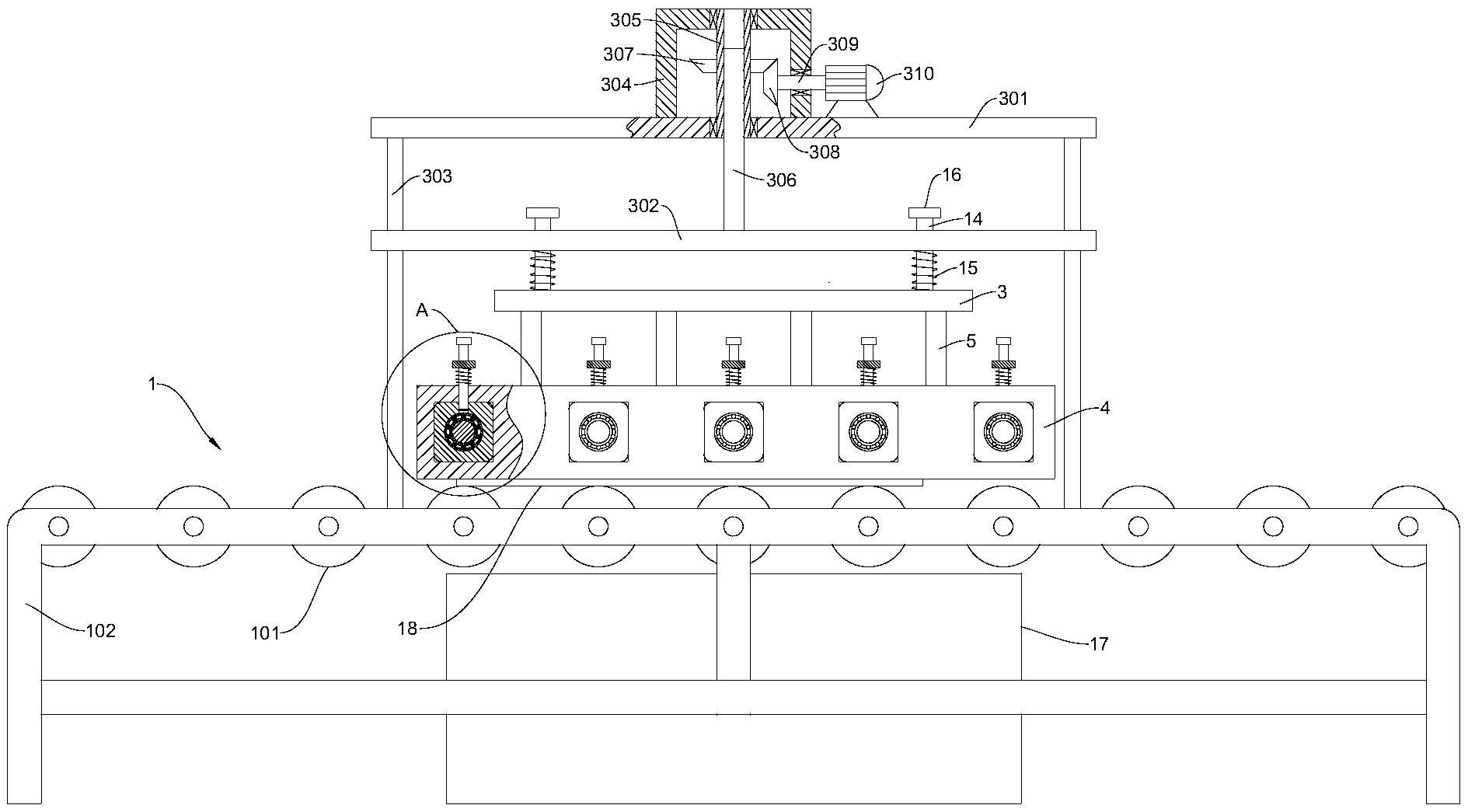 本实用新型提供了一种钻孔后披锋连线打磨装置,包括传输机构,传输机构上方设有横支板,横支板的顶部设有驱动机构;横支板的底部两侧连接有侧支板,两个侧支板之间并列设有若干打磨辊,打磨辊上套设有周向固定的打磨套,打磨辊的一端固定连接有第一挡板,打磨辊的另一端可拆卸地连接有第二挡板,靠近第一挡板的侧支板上转动连接有第一转轴,靠近第二挡板的侧支板上设有矩形孔,矩形孔内设有相配合的矩形座,该侧支板上设有用于固定矩形座的固定部件,矩形座上转动连接有第二转轴,第一转轴和第二转轴靠近打磨辊端部的一端均呈多边形结构,打磨辊的端部中心设有与多边形结构配合的盲孔。本实用新型便于打磨辊的更换,便于适应不同厚度的电路板。