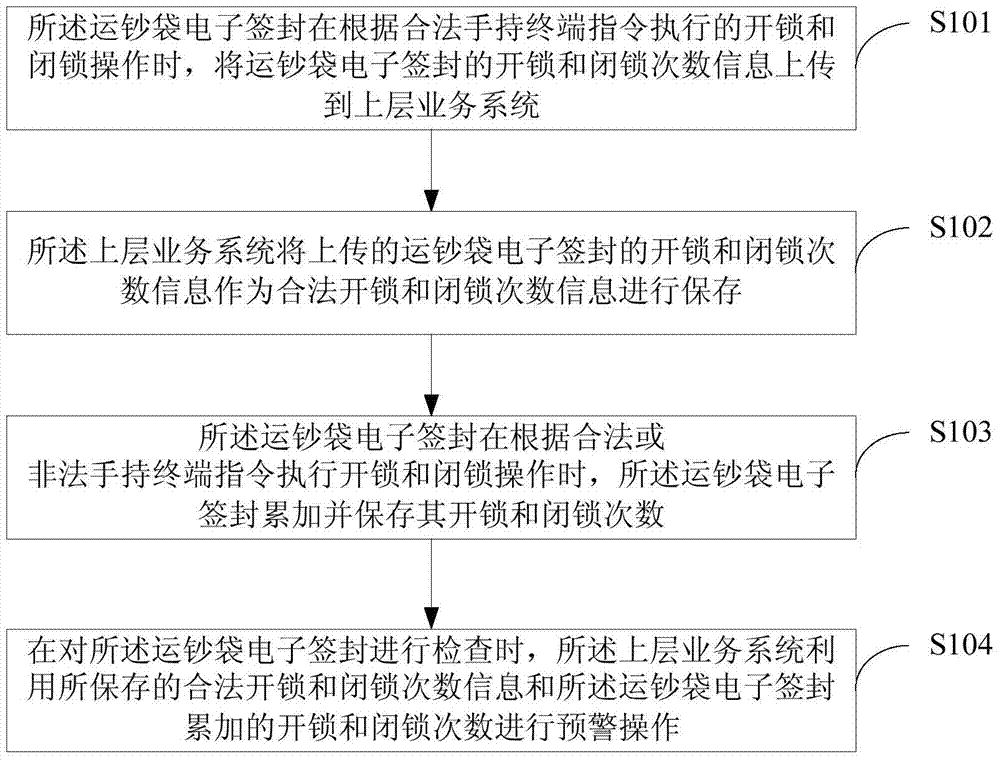 本发明公开了一种基于计数器的电子签封预警方法及装置,涉及电子签封技术领域,其方法包括以下步骤:所述运钞袋电子签封在根据合法手持终端指令执行的开锁和闭锁操作时,将运钞袋电子签封的开锁和闭锁次数信息上传到上层业务系统;所述上层业务系统将上传的运钞袋电子签封的开锁和闭锁次数信息作为合法开锁和闭锁次数信息进行保存;所述运钞袋电子签封在根据合法或非法手持终端指令执行开锁和闭锁操作时,所述运钞袋电子签封累加并保存其开锁和闭锁次数;在对所述运钞袋电子签封进行检查时,所述上层业务系统利用所保存的合法开锁和闭锁次数信息和所述运钞袋电子签封累加的开锁和闭锁次数进行预警操作。