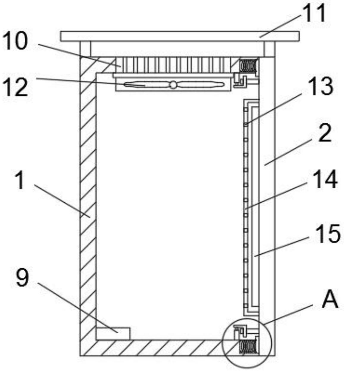 本实用新型公开了一种基于通讯网络的安全智能开关柜,包括柜体,所述柜体的一侧设置有开关门,所述开关门通过合页与柜体的侧壁转动连接,所述开关门的外表面一侧靠近顶部与底部的位置均固定连接有固定板,所述柜体的内底壁固定连接有网络远程控制开关,所述柜体的内底壁和内顶壁分别固定连接有电动推杆,所述电动推杆位于靠近开关门的一侧,所述电动推杆的驱动端固定连接有7型销。本实用新型通过设置物联网控制的自动开关装置方便了开关柜的开关,不需要使用钥匙,避免了钥匙的丢失,开关门的外部不设把手和锁孔使其不能从外面打开,增加了开关柜的安全性,通过散热装置和防潮装置的设置,保证了内部元件的正常使用,提高了元件的使用寿命。