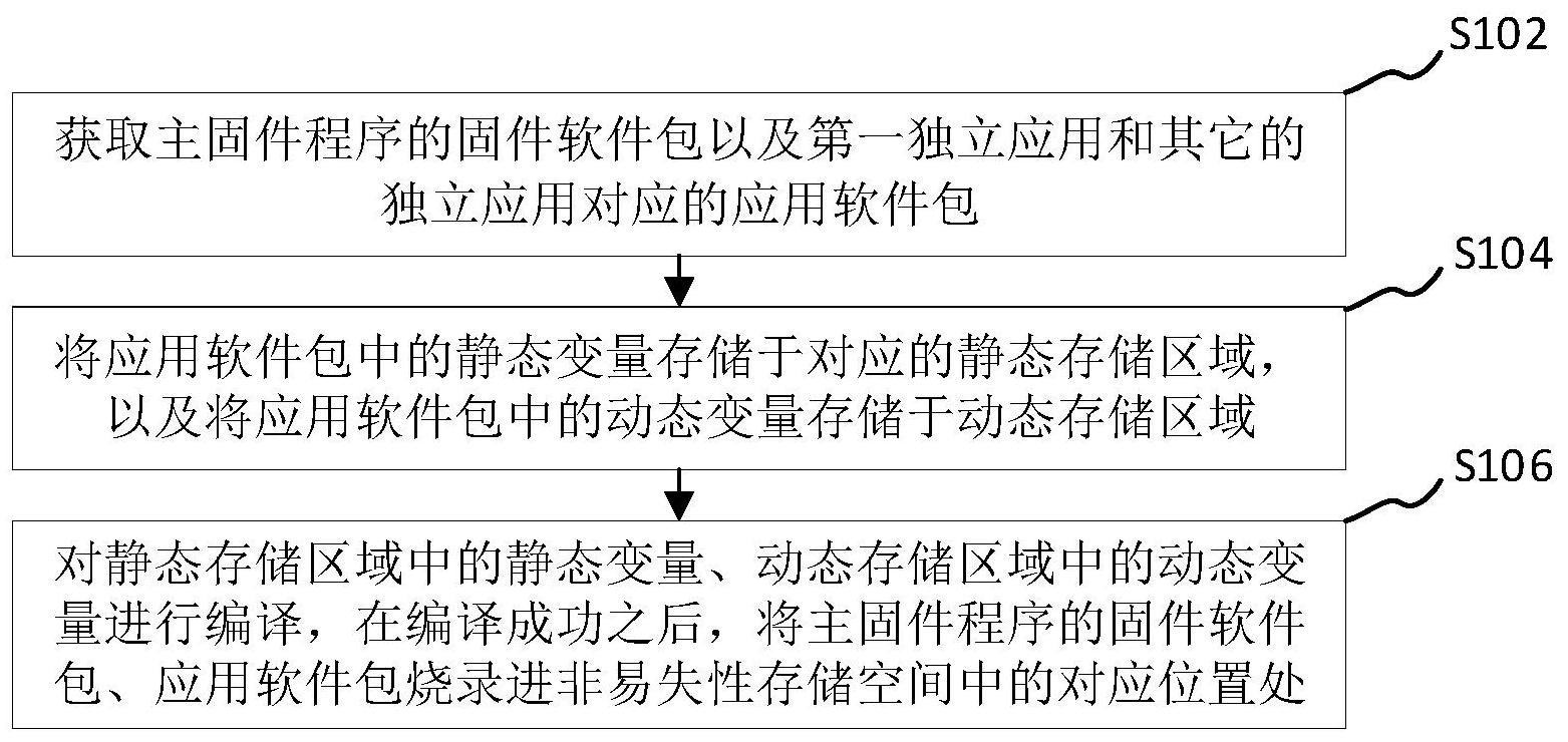 本申请涉及一种存储架构下的软件存储方法、装置、计算机设备和存储介质。所述方法包括:获取主固件程序的固件软件包以及第一独立应用和其它的独立应用对应的应用软件包;将所述应用软件包中的静态变量存储于对应的静态存储区域,以及将所述应用软件包中的动态变量存储于动态存储区域;对所述静态存储区域中的静态变量、所述动态存储区域中的动态变量进行编译,在编译成功之后,将所述主固件程序的固件软件包、所述应用软件包烧录进非易失性存储空间中的对应位置处。采用本方法能够使得固件软件包和应用软件包村烧录进同一非易失性存储空间的不同位置处,为后续加载运行实现相应的产品功能提供基础。