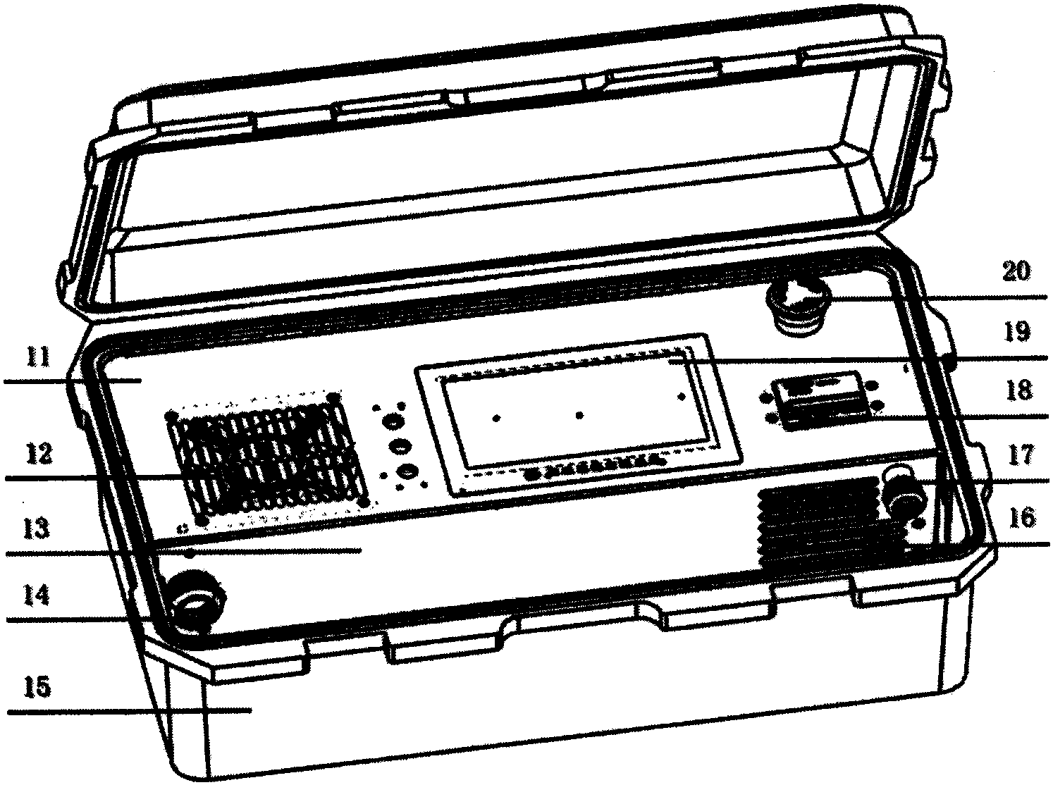 一种充电枪线内置的电动汽车用便携式充电机,由构成充电机的电气部件和电子部件、L形钣金机架(11)和工程塑料机箱(15)组成;L形钣金机架(11)的前立面(19)与工程塑料机箱(15)的三个内侧面形成枪线放置仓(13);钣金机架(11)设有散热风扇出风口(12)、散热进风口(16)、充电枪出线口(14)、电源进线口(17);其电气部件和电子部件装置在L形钣金机架(11)的内外侧面上;L形钣金机架(11)上装置有显示屏单元(7)、工作状态指示灯(18)、紧急停止按钮ST、微型断路器(1)、整流模块(2)、散热风扇(9)、辅助电源(5)、直流输出继电器(3)、显示屏单元(7)的下方装置有控制器单元(4)。