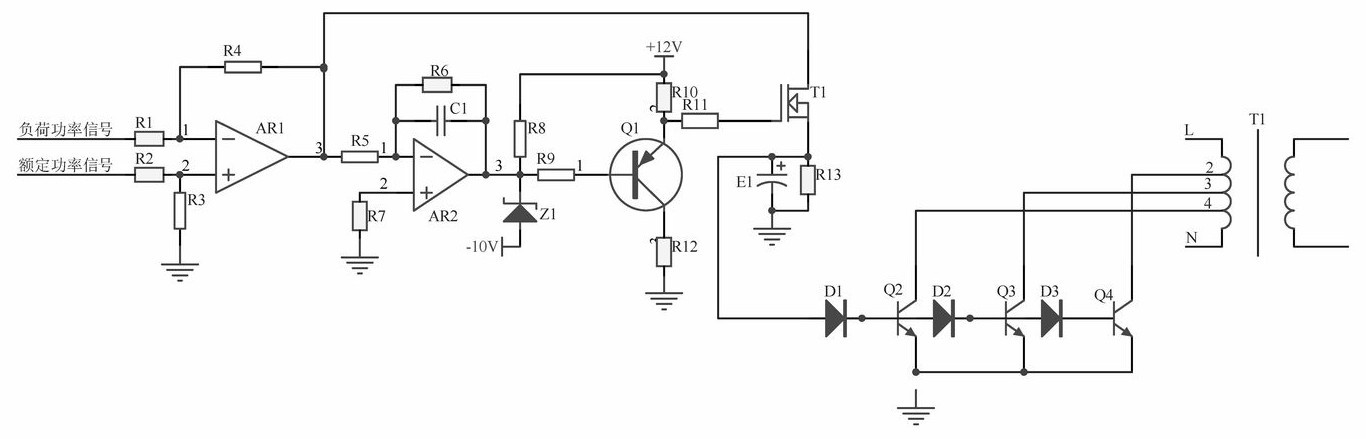 本实用新型的配电柜功率补偿装置,所述功率差电路采用差动放大器计算出配电柜输出的额定功率信号和负荷功率信号的差值,差值信号进入过负荷预判电路,首先采用运放AR2为核心的积分器计算出差值信号的变化率,之后经低压触发导通电路检测是否过负荷,过负荷时,三极管Q1导通,触发功率补偿电路中场效应晶体管T1导通,负荷功率信号触发三极管Q2‑三极管Q4导通,改变配电柜变压器的容量,也即初级绕组的匝数,进而调节输出电压,实现功率补偿,避免长时间过负荷运行,能减少过负荷保护装置因功率不匹配造成的动作,能有效的提高配电柜的正常运行。