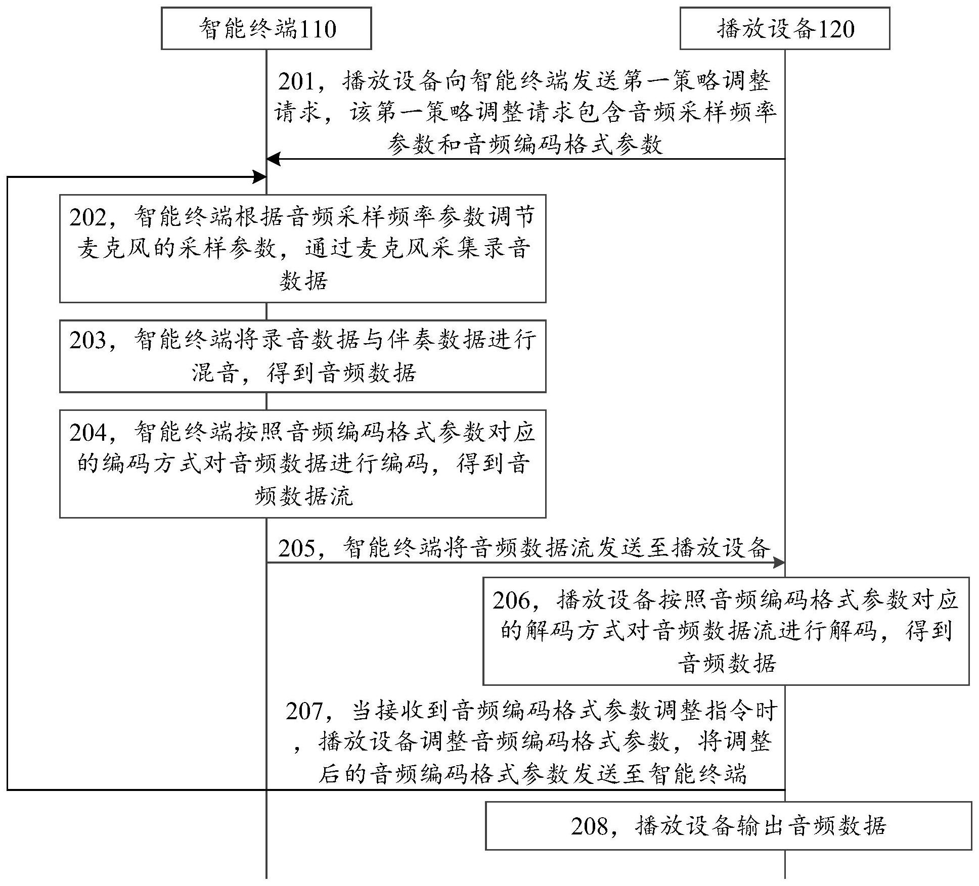 本发明公开了一种音频数据传输方法及装置,属于数据传输领域。该音频数据传输方法包括:接收播放设备发送的第一策略调整请求,获取所述第一策略调整请求中包含的音频采样频率参数和音频编码格式参数;根据所述音频采样频率参数调节麦克风的采样参数,通过所述麦克风采集录音数据;将所述录音数据与伴奏数据进行混音,得到音频数据;按照所述音频编码格式参数对应的编码方式对所述音频数据进行编码,得到音频数据流;将所述音频数据流发送至所述播放设备。本发明解决了相关技术中K歌需要一套专业的硬件设备支持,导致用户不能随心所欲,随时随地的K歌,达到了降低K歌所需要的硬件要求,使得用户能随时随地的K歌的效果。