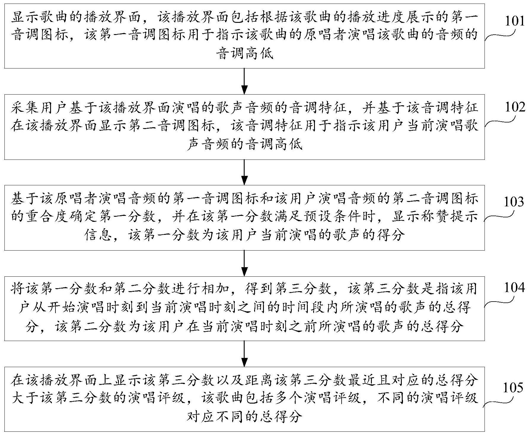本发明公开了一种演唱评分的显示方法、装置及存储介质,属于终端技术领域。所述方法包括:显示歌曲的播放界面,基于原唱者演唱音频的第一音调图标和用户演唱音频的第二音调图标的重合度确定第一分数,并在第一分数满足预设条件时显示称赞提示信息,第一分数为用户当前演唱的歌声的得分;将第一分数和第二分数进行相加,得到第三分数,第三分数为用户从开始演唱到当前演唱时刻的时间段内演唱歌声的总得分;在播放界面上显示第三分数以及距离第三分数最近且对应的总得分大于第三分数的演唱评级。本发明通过显示实时的总得分可以向用户及时反馈当前的演唱成绩,通过显示下一个演唱评级可以对用户进行激励,从而可以提高用户粘性。