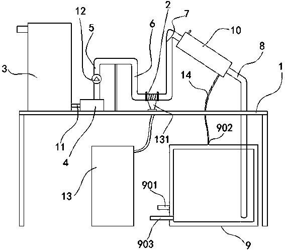 本实用新型公开了一种酒类加工用高温瞬时杀菌机,涉及液体杀菌技术领域。本实用新型包括工作台、管道泵、冷凝器,还包括高频感应加热机、酒水储液罐、双层冷凝储液罐、第一L形弯管和第二L形弯管;酒水储液罐、管道泵、第一L形弯管、第二L形弯管和冷凝器从左到右依次设置在工作台上表面;高频感应加热机和双层冷凝储液罐设置在工作台下方;高频感应加热机上的感应加热线圈固定在工作台上表面;酒水储液罐出液口通过第一连接管与管道泵进液口连接;管道泵出液口通过第二连接管与第一L形弯管竖向端部连接。本实用新型通过设计的高频感应加热机加热杀菌加热器进行生产灌装前杀菌的方式进行高温快速杀菌,整体结构占用空间小。