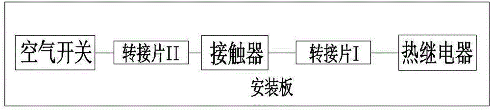 本实用新型公开了电容补偿接触器上下连接结构,主要由安装板以及安装在安装板上的空气开关、接触器、热继电器组成,所述的接触器通过反Z字型结构的转接片I连接热继电器,所述的接触器通过反Z字型结构的转接片II连接空气开关,将空气开关、接触器和热继电器安装在同一安装板上,依据器件之间的电气性能要求而设计转接片I和转接片II,利用转接片II代替导线进行空气开关和接触器之间的连接,利用转接片I代替导线进行接触器和热继电器之间的连接,既节约了器件间的安装空间及导电金属片长度又保证了导电体之间的良好接触,减少原件发热,降低故障率,提高器件的使用寿命,整个结构具有设计合理、经济实用、安装方便等特点。