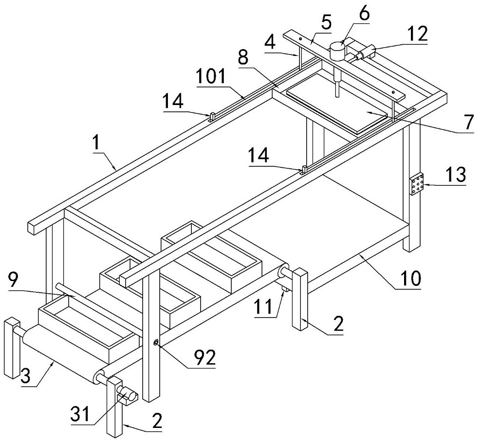 本实用新型涉及一种辣条包装盒自动包装设备,包括第一机架、第二机架、运输带和电机;第一机架的顶部设有滑槽,滑槽内设有限位杆,限位杆的顶部设有支撑板,支撑板的顶部设有电动推杆,电动推杆的底部设有粘板,粘板的下方设有封膜放置盒,封膜放置盒内设有密封膜,运输带的上方设有胶筒,运输带的下方设有支撑板,支撑板的底部设有重量感应器,支撑板的一侧设有液压缸;第一机架上设有PLC控制装置,当包装箱触及胶筒时,强力胶被挤出,接着电动推杆向下推动粘板,将密封膜粘于粘板上,当包装箱落至支撑板上时,液压缸被启动,推动支撑板至指定位置;启动电动推杆,电动推杆通过粘板对包装箱的顶部进行按压进行密封,结构简单,自动化程度高。