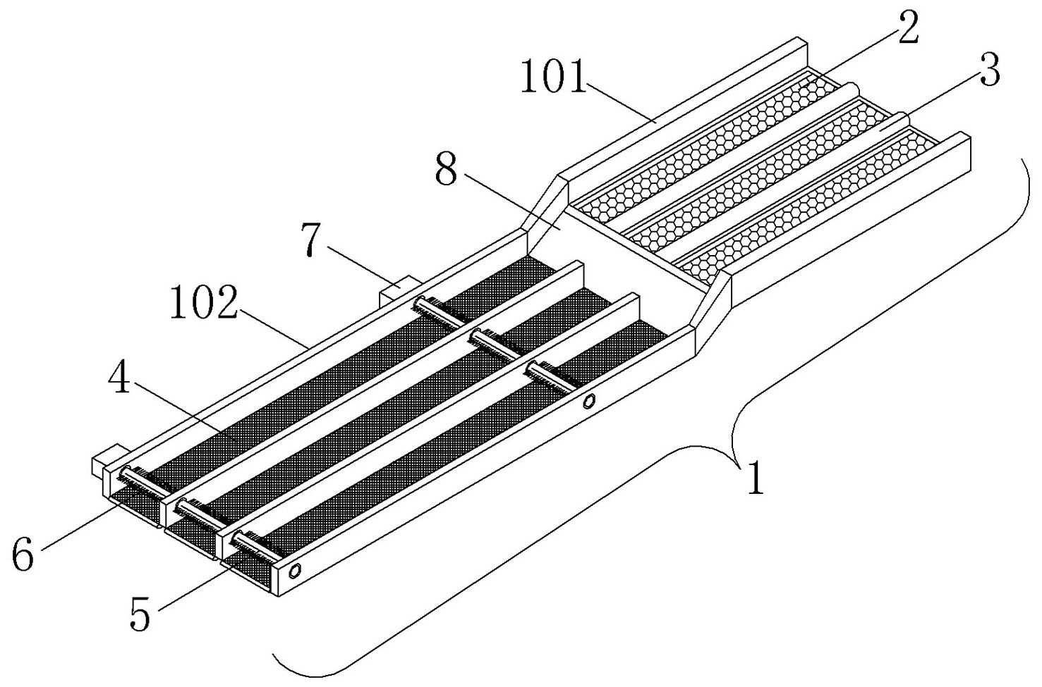 本实用新型涉及一种辣条分拣设备,包括运送台,所述运送台包括下料架和输送架,所述下料架的底部铺设于有滤网,所述滤网的两端设置有分隔带,所述输送架位于下料架的下方,所述输送架的内部安装有传送带,所述输送架位于传送带的上方贯穿有转杆,所述转杆的外围设有塑胶条,所述输送架的侧面安装有电机,所述电机的输出端与转杆连接。本实用新型具有如下有益效果:通过在运送台的下料架上铺设有滤网,可将辣条表面多余的油料过滤掉,然后进入下料架输送时,经过转杆外围的塑胶条拨动,将堆叠在一起的辣条分离开,避免相互粘连油料,导致布料不均匀的问题;同时塑胶条还可将辣条拨动成条状,避免横七竖八输送,导致分拣后装袋时影响美观。