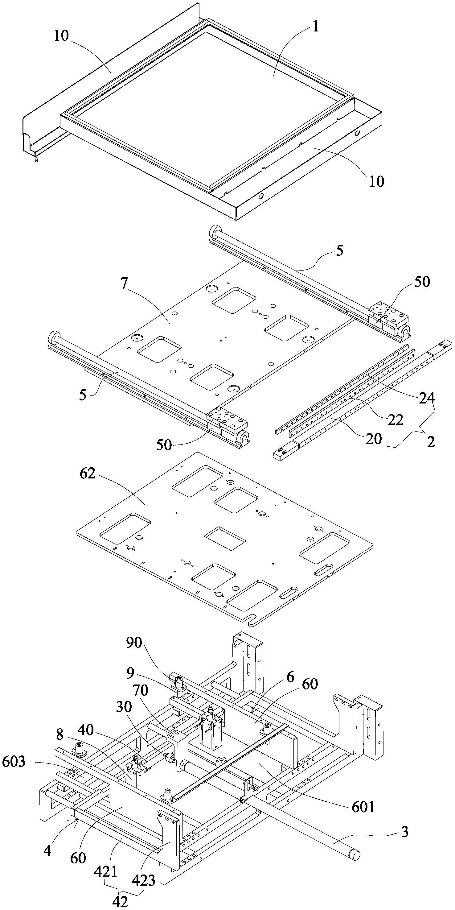 本实用新型实施例提供一种喷墨印刷机的喷头保湿刮墨装置,包括组装于喷墨印刷机的喷头模组停机位置下方的保湿盘、横设于保湿盘上方的刮墨板以及与刮墨板相连用于驱动刮墨板在喷头模组底部往复移动以对喷头模组的喷墨端实施刮墨作业的刮墨驱动件,刮墨驱动件组装于保湿盘下方,刮墨驱动件的输出轴借助转接支架与刮墨板相连,转接支架包括横设于保湿盘下方且相对两端分别从保湿盘相对两侧伸出的支撑杆以及分别设置于保湿盘两侧且均以一端与支撑杆相连而另一端向上延伸与刮墨板相应端部相对固定的连接杆,刮墨驱动件的输出轴与支撑杆相连。本实施例能优化空间布局,减小占用体积。