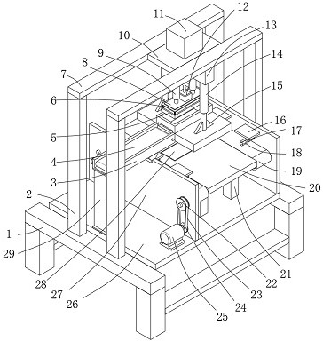 本发明提供一种具有金属缝合机构的腕部固定带加工装置,属于医疗器械生产技术领域,该具有金属缝合机构的腕部固定带加工装置包括底架,所述底架的上表面固定连接有支撑杆,所述支撑杆的上表面固定连接有支撑横板,所述支撑横板的下表面固定连接有第一液压器,所述支撑横板的下表面固定连接有固定块,所述固定块的下表面固定连接有第二液压器。通过设置第二传送带,可以将原料送到工作台上,通过第一传送带,可以将辅助布料送到限位板内,由挡板进行承接,在第二液压器的作用下,使限位板下降直至贴到原料上然后停止,然后液压杆开始工作,使挡板收到固定盒内,辅料在重力作用下往下落,从而解决了现有技术中给金属板固定时不方便的问题。