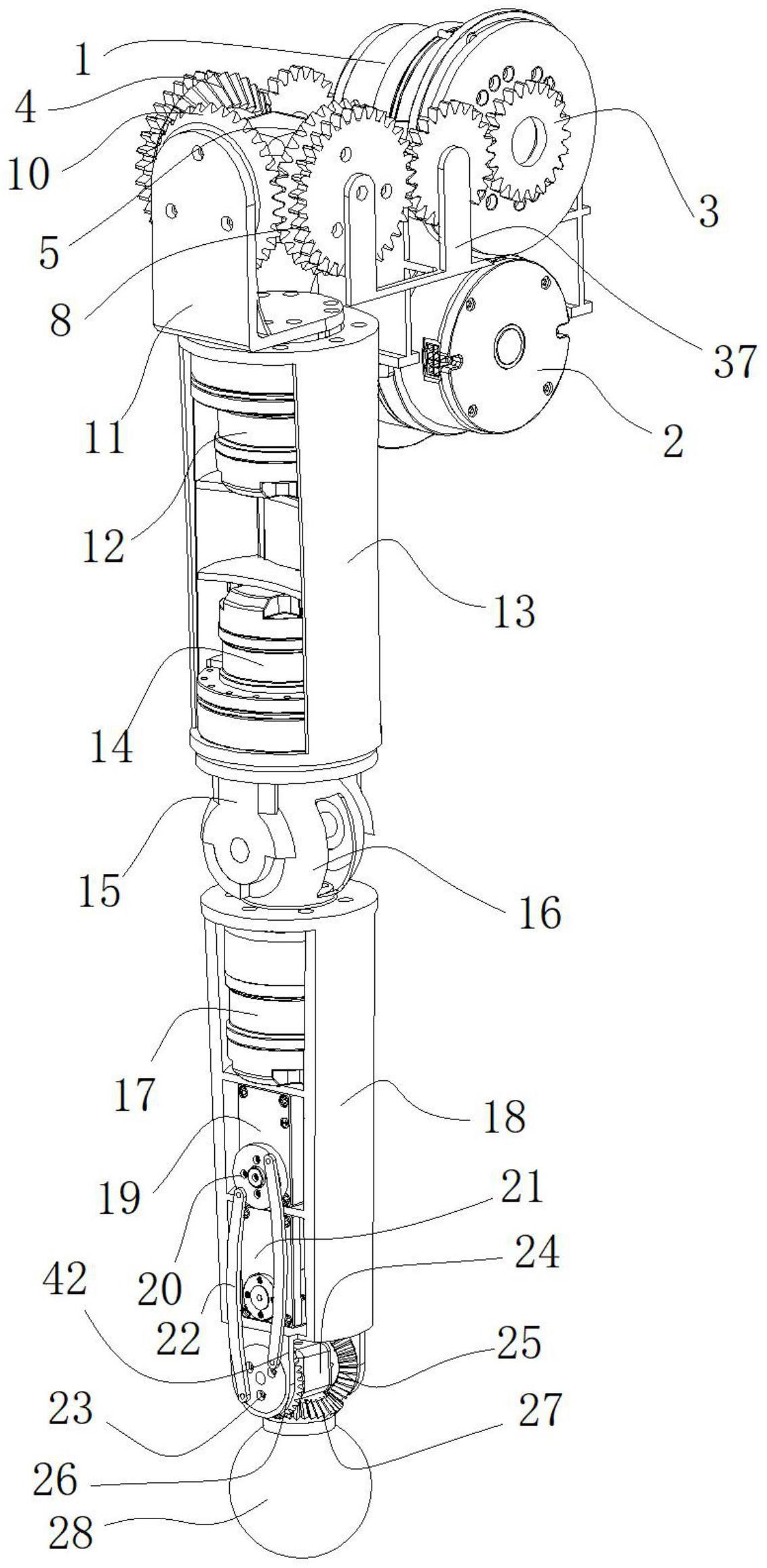 本发明公开了基于差分机构的仿人机械臂,涉及机械臂领域,本发明的技术方案包括第一差分机构、第一肩部电机、第二肩部电机、第三肩部电机、大臂件、肘关节组件、第一肘部电机、第二肘部电机、小臂件、第二差分机构、第一腕部电机和第二腕部电机;肘部锥齿轮机构保证了肘部两交叉自由度电机的串联布局,同时电机置于大臂和小臂内,保证了整个机械臂外观的完整性,在满足关节各自由度互相耦合的同时,使关节部分的体积控制得更小,整体制造和控制难度更低。